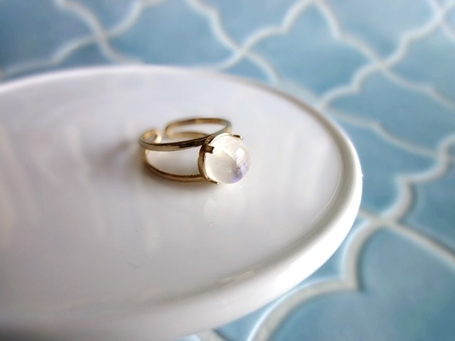 透明感のある白い石の中に、柔らかく揺らめく虹色のシラーが浮かぶ、ホワイトラブラドライト。そのホワイトラブラドライトで指輪をご用意しました。 別名「レインボームーンストーン」とも呼ばれるこの石は、満月の夜に優しく降り注ぐ光を思わせる神秘的な美しさで、心を静かに満たしてくれます。光の角度が変わるたび、青や緑、淡い虹色の輝きがさりげなく浮かび上がり、控えめながらも深い存在感を放ちます。 直径約8mmの天然石のカボションを、繊細な透かし模様の真鍮枠で優しく包み込みました。今回はゴールド色の指輪でご用意しました。小さな箱に入れてお届けします。 ■品番■ CR -8-1-G ■天然石■ ホワイトラブラドライト 別名:レインボームーンストーン ■サイズ■ 石:8mm 指輪サイズ:フリーサイズ(対応9号~13号) ■素材■ 真鍮メッキ ゴールドメッキ 【受注生産方式】 ご注文・ご入金確認後、お時間をいただいて製作・発送いたします。 お受け取りまでにお時間がかかりますので、ご注意ください。 土曜日・日曜日・祝日は発送業務はお休みとなります。 ■画像について■ 画像について、できる限り現物に近い状況を再現するよう心がけておりますが、PC環境などの影響により画像と現物の印象が若干異なる場合があります。画像の著作権は放棄しておりません。画像の無断引用はお断りいたします。 ■天然石について■ 天然石は濁り・内包物、欠け・傷、発色のむらなどがあります。また、画像に映し切れない細かい傷や内包物もあります。一粒一粒、その色や透明感などには、個性があり、それが天然石である証でもあります。画像について、できる限り現物に近い状況を再現するよう心がけておりますが、PC環境などの影響により画像と現物の印象が若干異なる場合があります。