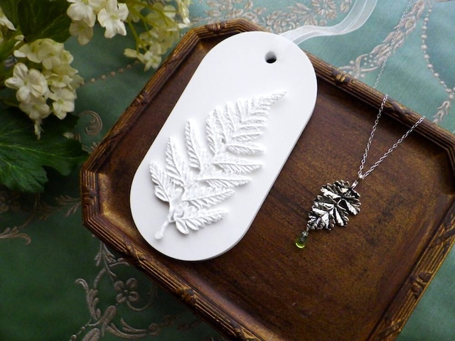 植物好き、ボタニカル好きのためにご用意いたコフレセットです。内容はシダ植物のオーナメントと木の葉のデザインのペンダントネックレス、計2点。それぞれを箱に入れてお届けします。 ペンダントネックレスは、トップ部分は古代銀色の植物モチーフで、さらに天然石、8月の誕生石であるペリドットのしずくをぶら下げました。朝露が木の葉から落ちる瞬間を再現したペンダントネックレスです。 オーナメントは、細かいところまで丁寧に仕上げたシダ植物のデザインのアロマストーン製のオーナメント。土台の色をホワイト、ブルーグレー色、どちらかを選べます。無垢な真っ白いオーナメントで神聖な世界観になります。また、落ち着きのあるブルーグレー色の背景に真っ白いモチーフを合わせると、洋食器にみかけるカメオ調のデザインになり、より格式高い仕上がりとなります。 ■品番■ Seasonal ornament-2-13-set-C ■素材■ オーナメント:石膏、オーガンジーリボン ペンダントネックレス:合金ゴールドメッキ、天然石(ペリドット) 紙箱 ■セット内容・サイズ■ アロマストーン全体:105×54×15mm ペンダントネックレス: トップ部分:古代銀色の木の葉30×18mm、ネックレス:50cm+アジャスター3cm ■オプション■ オーバルの土台の色 ホワイト:染色なし ブルーグレー色:手に触れても安全な塗料を使用しています -------- オプションは備考欄にご記入ください。------- ■オプション1■ ネックレスの長さ ネックレスの長さは40-45-50-55-60cmで変更できます。 留め具:アジャスター(5cm)は元々ついています。 不要の場合はお申し付けください。 ■オプション2■ アロマオイル ラベンダー シダーウッド ヒノキ ユーカリ&ペパーミント シトロネラ パルマローザ 無料でアロマオイルを数滴、裏面につけてお届けいたします。アロマオイルを梱包の時点で垂らしますが、配送中に香りが飛んでしまう可能性もございます。香りが足りないと感じた場合は、お手持ちのアロマオイルを追加してください。 【受注生産方式】 ご注文・ご入金確認後、お時間をいただいて製作・発送いたします。 お受け取りまでにお時間がかかりますので、ご注意ください。 土曜日・日曜日・祝日は発送業務はお休みとなります。 発送までに2週間、お時間を頂戴します。発送までの期間がこちらの作品は長いです。必ずご確認の上、ご注文ください。 ------ ご注文の前に以下の注意事項をご確認ください。 ----- ■アロマストーンについて■ 裏面にアロマオイルを垂らし、しみ込ませることでゆっくりと香りが広がります。香りを楽しむことで心を癒すインテリア雑貨です。石膏を固めてつくるので、丁寧にお作りしていますが、小さな気泡や欠けが発生します。 ■画像について■ 画像について、できる限り現物に近い状況を再現するよう心がけておりますが、PC環境などの影響により画像と現物の印象が若干異なる場合があります。画像の著作権は放棄しておりません。画像の無断引用はお断りいたします。 ------ 関連作品リンク -------- 【単品販売】白いアロマストーン OVAL ■ オーナメント ■ シダ植物 【セット販売】ボタニカル好きのためのコフレセット B 【セット販売】ボタニカル好きのためのコフレセットC
