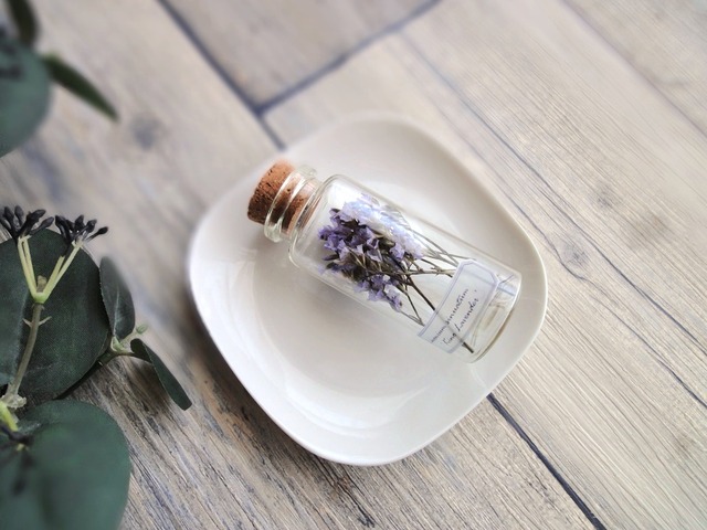 手のひらサイズのガラス瓶に、ドライフラワーを丁寧に詰め込みました。 すりガラスのようなマットラベルには、ひとつひとつ、植物の学名を印刷しています。 ドライフラワーの状態は画像でご覧いただける通り、ひとつひとつ異なります。 ご了承の上、ご注文ください。 ■ドライフラワー■ No.2 スターチス キノラベンダー ■サイズ■ ボトルサイズM 直径3×7.5cm ■ラベル■ 水に弱い印刷ですのでご注意ください。 ご自分で簡単にはがせるラベルです。 【受注生産方式】 ご注文・ご入金確認後、お時間をいただいて製作・発送いたします。 お受け取りまでにお時間がかかりますので、ご注意ください。 土曜日・日曜日・祝日は発送業務はお休みとなります。 ■画像について■ 画像について、できる限り現物に近い状況を再現するよう心がけておりますが、PC環境などの影響により画像と現物の印象が若干異なる場合があります。画像の著作権は放棄しておりません。画像の無断引用はお断りいたします。 ■ドライフラワー・プリザーブドフラワーを使用した作品について■ 自然の植物を加工した素材は、形や色に個体差がございます。また、変色や穴あきなどもございます。自然の美しさとしてその様子もご覧いただけるよう、なるべく自然なアレンジを心がけております。また、梱包する経緯や輸送中に折れてしまったり、取れてしまうことがあるかもしれません。なるべくそのようなことがないよう、注意しておりますが、不可抗力で起こる可能性がございますことをご理解の上でご注文ください。美しい状態を保持するためには直射日光・高温多湿を避け、定期的にほこりを落してください。