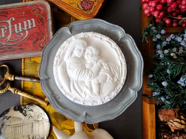 優しい微笑みを湛えた聖母に、しっかり抱きかかえられた神の子。そんな風に見ることができる、聖母子像のレリーフ。シンプルながらも温かみを感じるデザインです。 このアロマストーンをそっと置くだけで、クリスマスの雰囲気にもなります。大袈裟なクリスマスの飾りはお好みではない方にも喜ばれそう。このアロマストーンで大人のシンプルシックなクリスマスに。箱に入れてお届けします。 写真で使用している、小物は非売品です。 ■品番■ aroma-stone-52 ■素材■ 石膏、紙箱 石膏の性質上、水に濡れた手で触ったり、水がかからないよう、お取扱にご注意ください。 ■デザイン:サイズ■ アロマストーン:直径75×20mm BOXサイズ: 84×84×38mm ■オプション■ アロマオイルのご希望を備考欄にご記入ください。 ラベンダー シダーウッド ヒノキ ユーカリ&ペパーミント シトロネラ パルマローザ 無料でアロマオイルを数滴、裏面につけてお届けいたします。アロマオイルを梱包の時点で垂らしますが、配送中に香りが飛んでしまう可能性もございます。香りが足りないと感じた場合は、お手持ちのアロマオイルを追加してください。 ■納期■ 7日間:ご注文から発送までにかかる日数 お届けにかかる日数は、お選びになる配送方法により異なります。 【受注生産方式】 ご注文・ご入金確認後、お時間をいただいて製作・発送いたします。 お受け取りまでにお時間がかかりますので、ご注意ください。 土曜日・日曜日・祝日は発送業務はお休みとなります。 ------ ご注文の前に以下の注意事項をご確認ください。 ----- ■アロマストーンについて■ 裏面にアロマオイルを垂らし、しみ込ませることでゆっくりと香りが広がります。香りを楽しむことで心を癒すインテリア雑貨です。石膏を固めてつくるので、丁寧にお作りしていますが、小さな気泡や欠けが発生します。 ■画像について■ 画像について、できる限り現物に近い状況を再現するよう心がけておりますが、PC環境などの影響により画像と現物の印象が若干異なる場合があります。画像の著作権は放棄しておりません。画像の無断引用はお断りいたします。