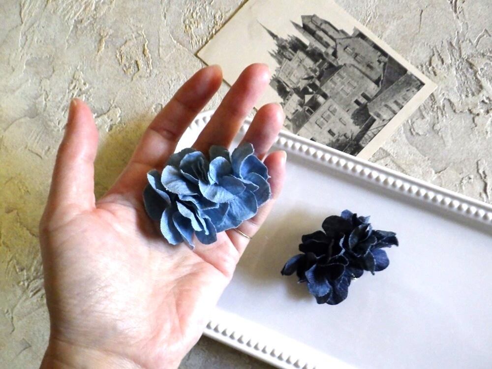 柔らかく触り心地の良いデニム素材で、紫陽花のポニーフックをご用意しました。爽やかなライトブルーとシックなブルーの2色展開。