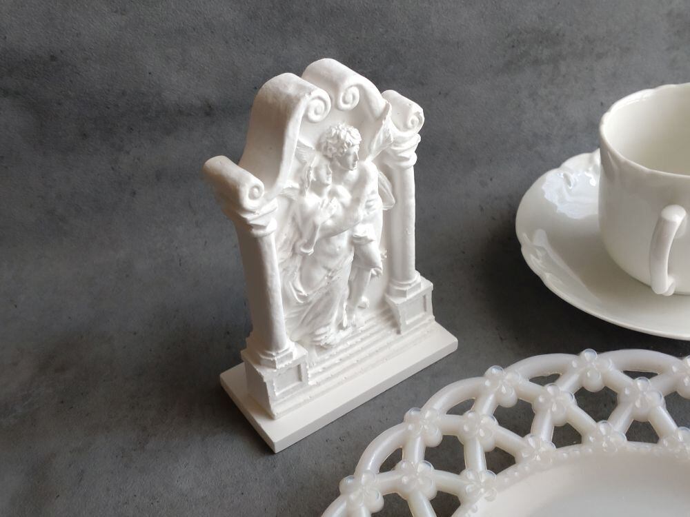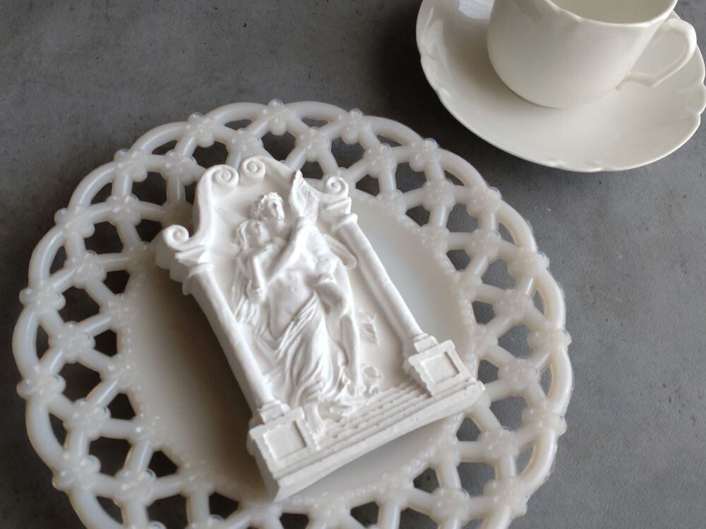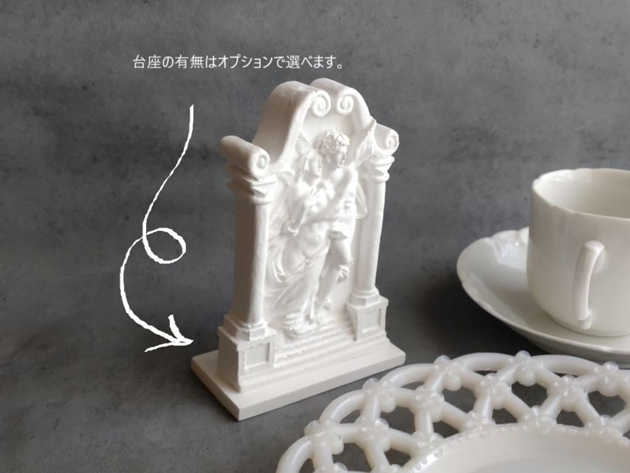 神殿の荘厳な建築物の様子、天使や女性のなめらかな肌の質感、揺れる衣服の質感など、質感の違いがレリーフの凹凸に出ています。とても神秘的でロマンチックなデザインです。