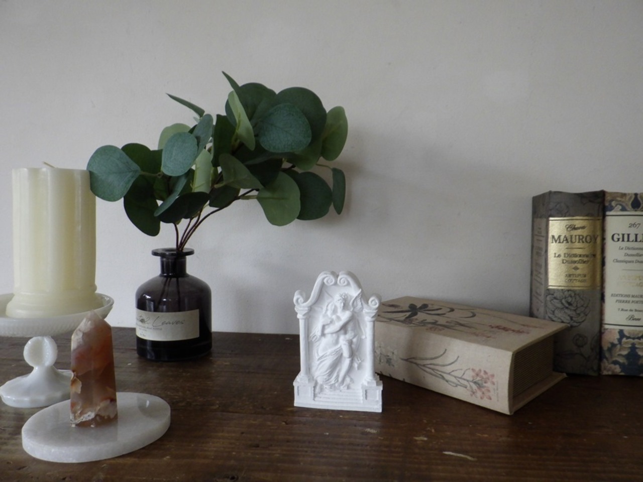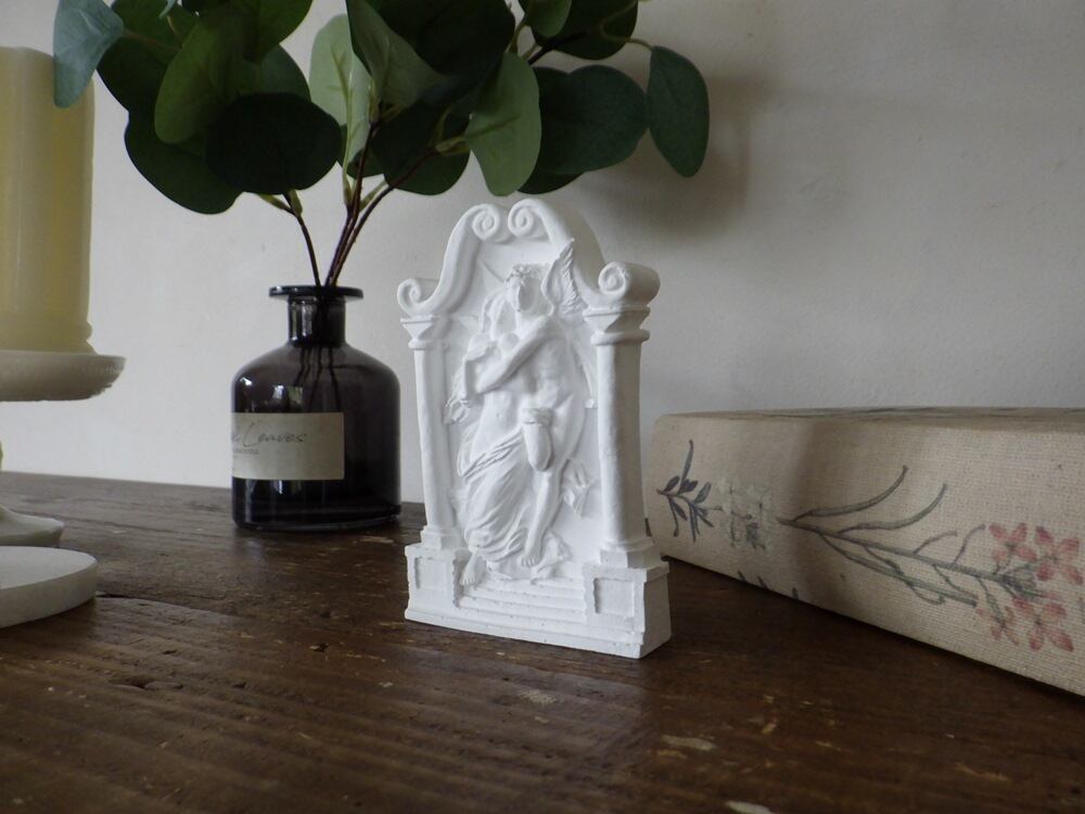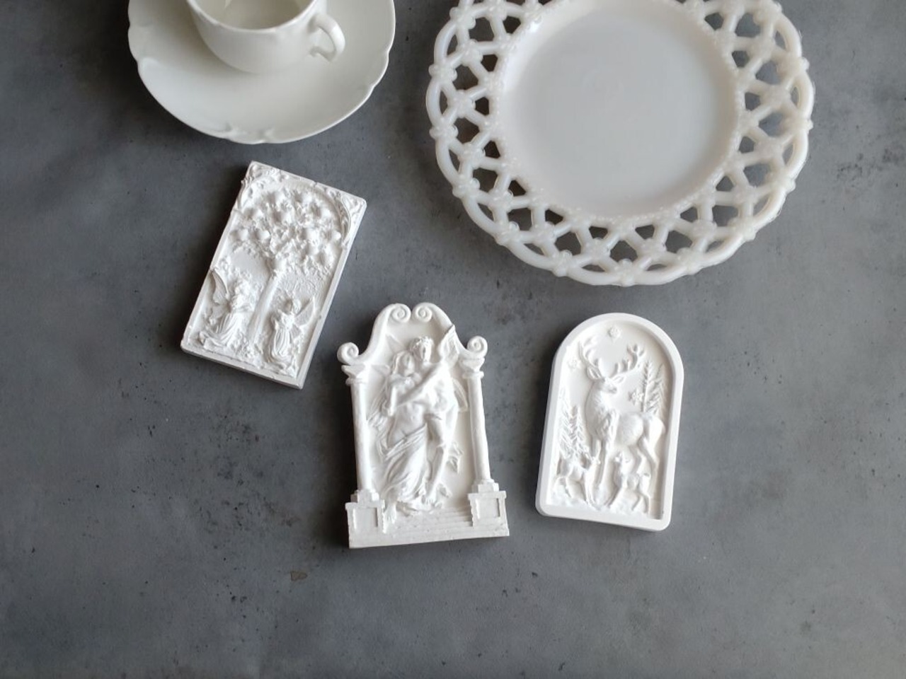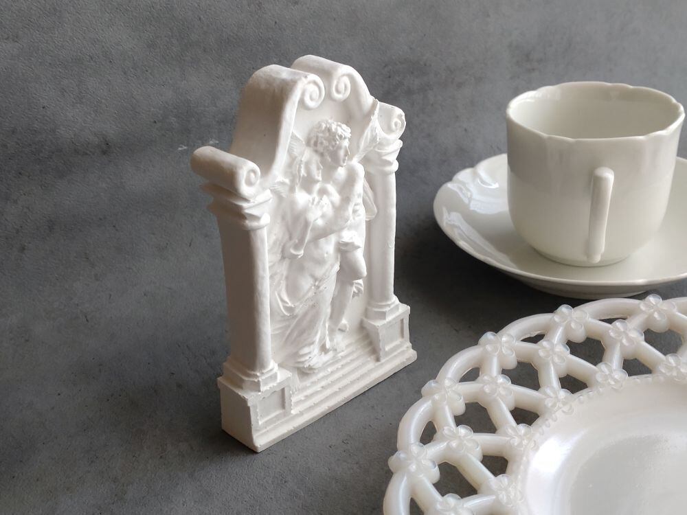 白い石膏でできた、切り取ったようなレリーフ。まるで古い石碑の一部のように美しいのです。その美しさを気軽にデスクやテーブルに飾って楽しんでほしいという思いからできた、インテリア雑貨です。