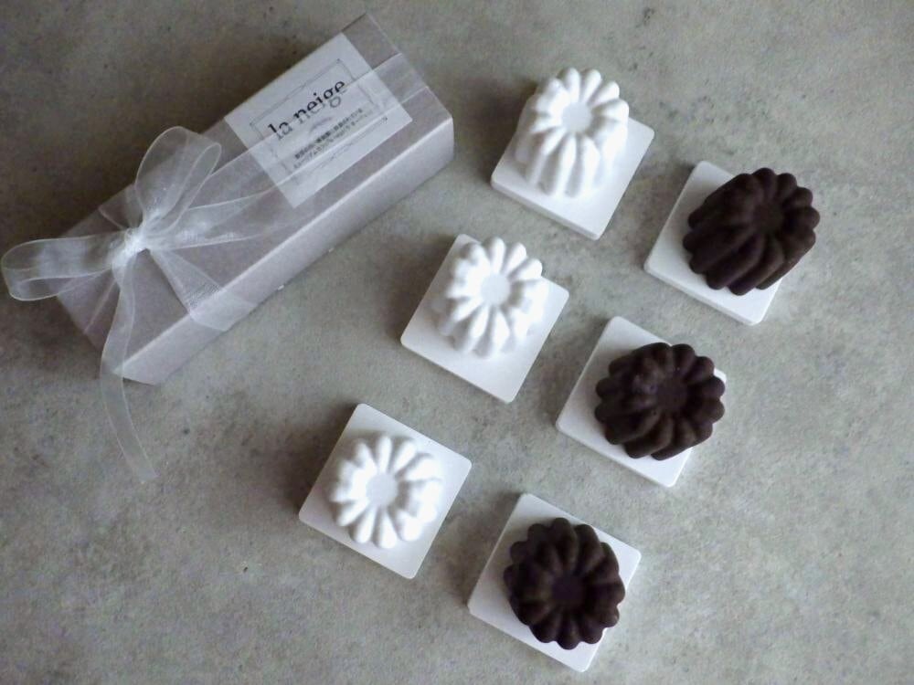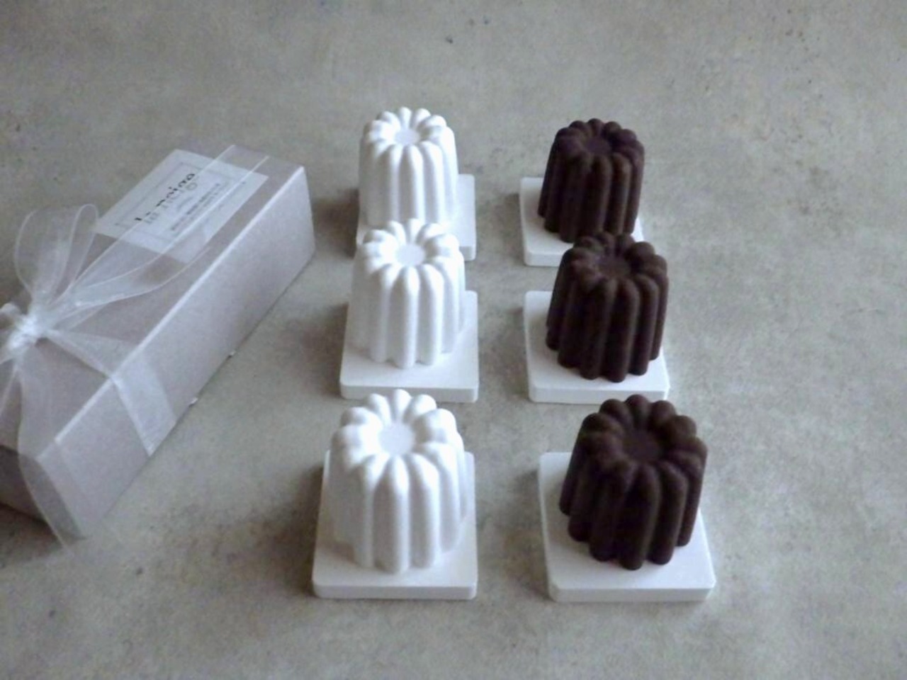 今回のカヌレは2色展開。ホワイトは真っ白い石膏の色、そのまま。ショコラブラウンはダークチョコレートの色に塗りました。オプションで選べます。