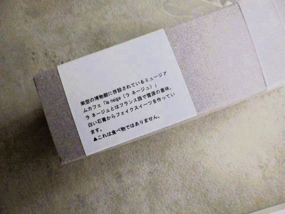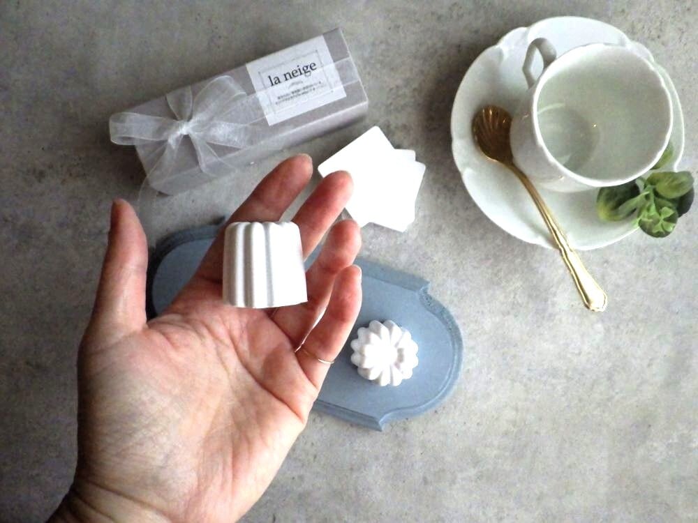 実は石膏でできた、フェイクスイーツです。アロマオイルやお好みの香水を染み込ませて、香りを楽しみつつ飾って楽しむインテリア雑貨です。贈り物にもぴったりです。裏面に「食べ物ではありません」と表示しています。