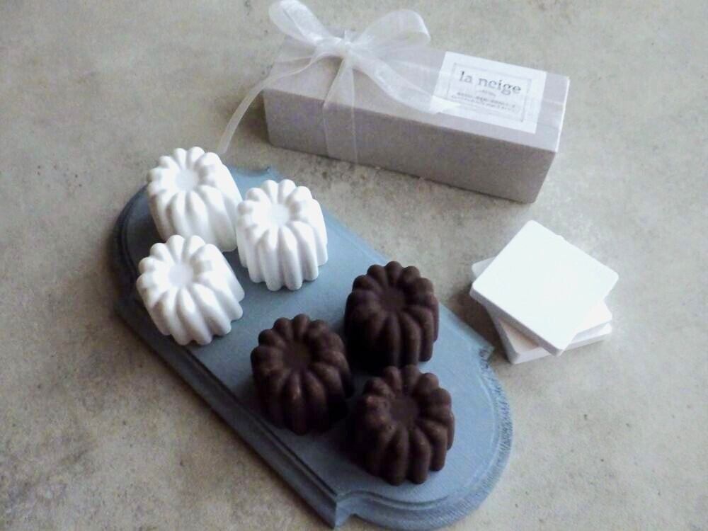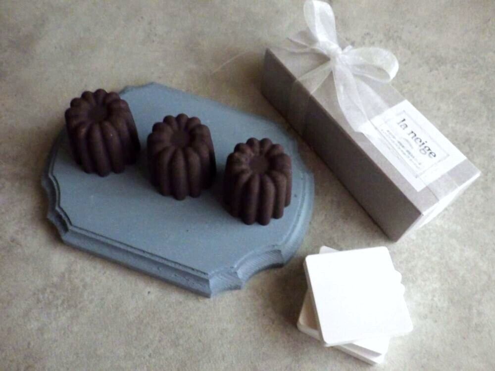 今回のカヌレは2色展開。ホワイトは真っ白い石膏の色、そのまま。ショコラブラウンはダークチョコレートの色に塗りました。オプションで選べます。