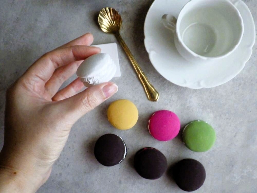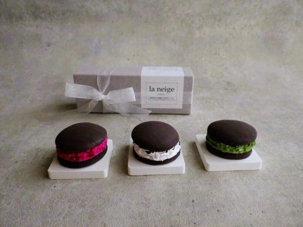 ミュージアムカフェ「la neige(ラ ネージュ)」で焼き菓子が新メニューに加わりました!手のひらに乗せると可愛い、小さなマカロンができました。マカロン1点と台座が3組セットになっての販売です。