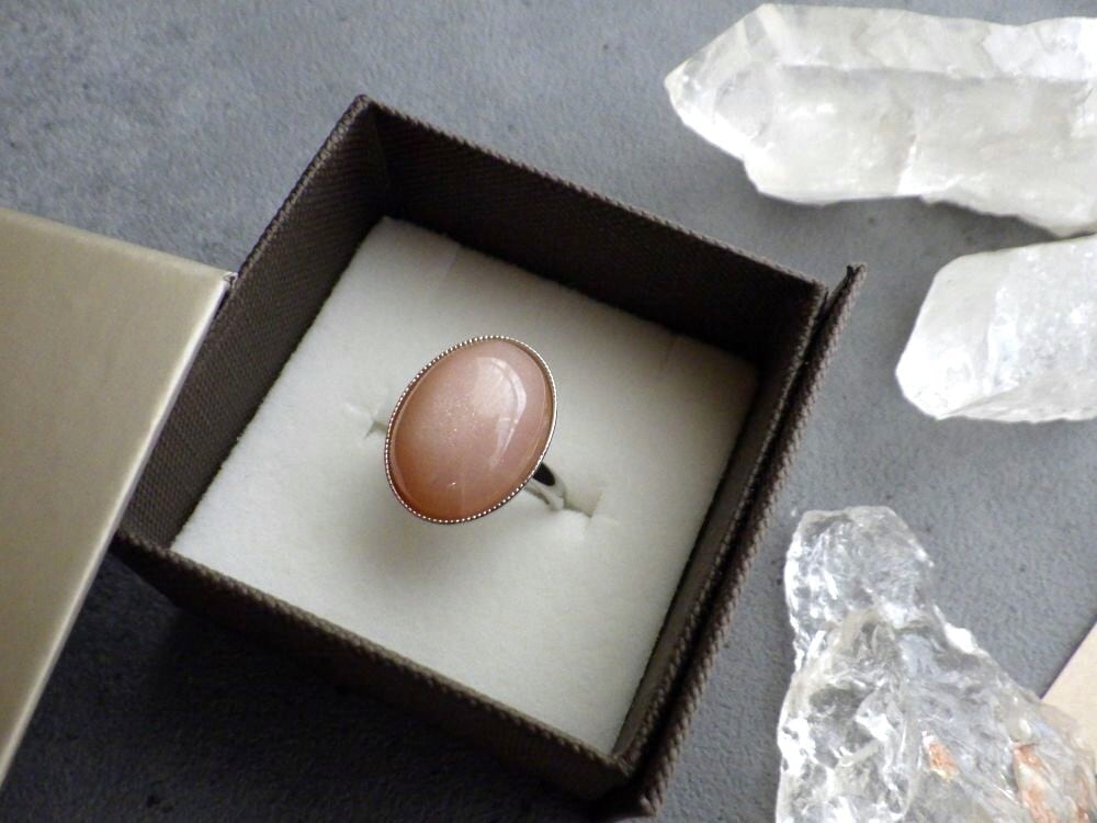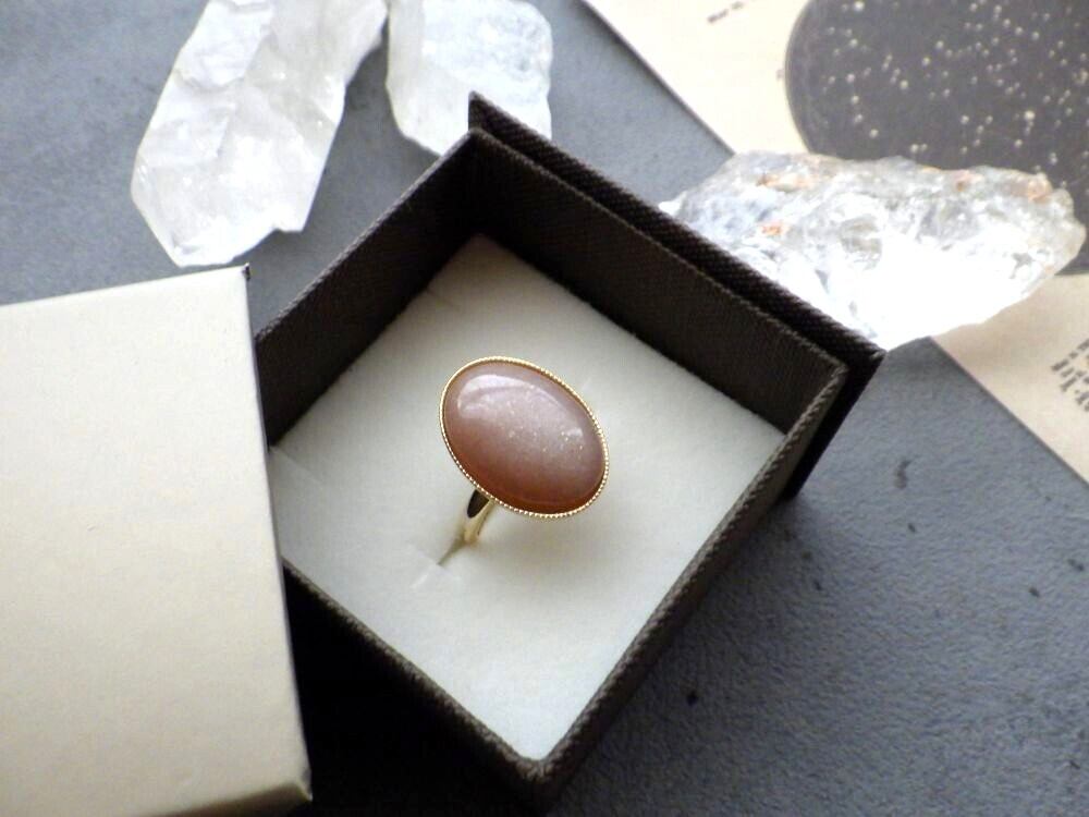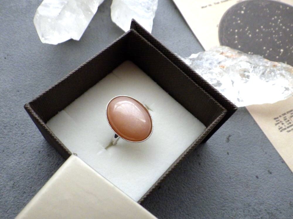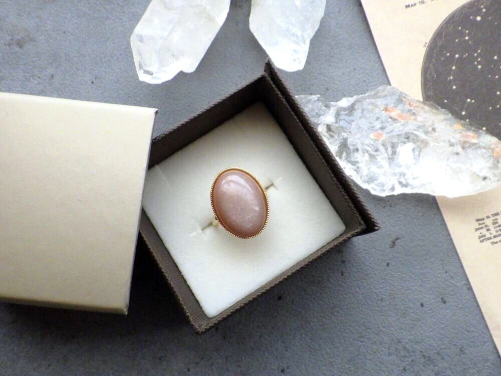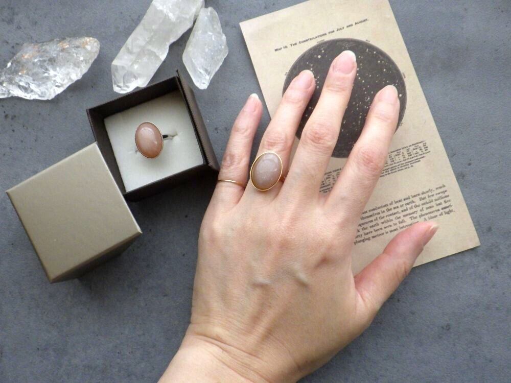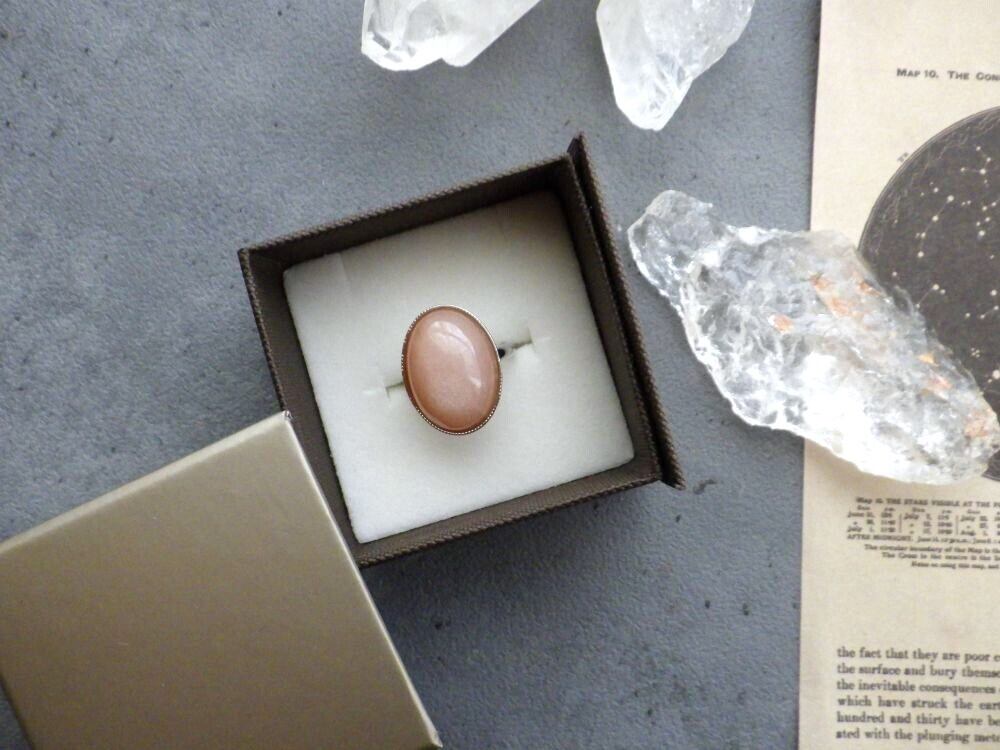 ムーンストーンには、ラブラドライトの一種、ホワイトラブラドライトの種類と、長石(フェルドスパー・フェルスパー)という鉱物の種類があります。今回は長石のピンク色のムーンストーンでシンプルな指輪に仕上げました。