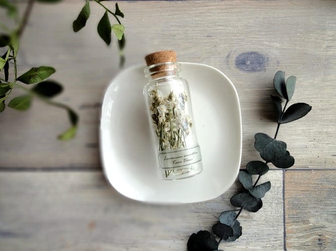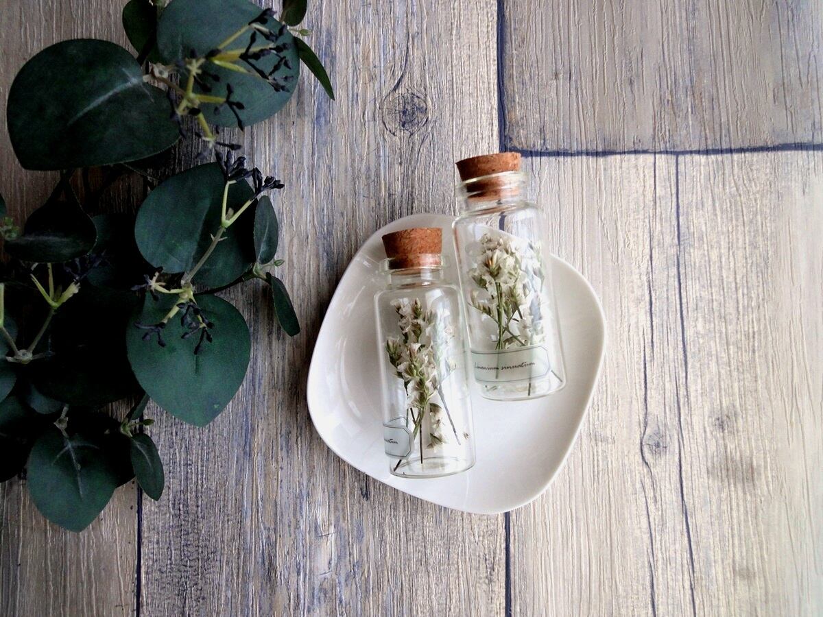 手のひらサイズのガラス瓶に、ドライフラワーを丁寧に詰め込みました。