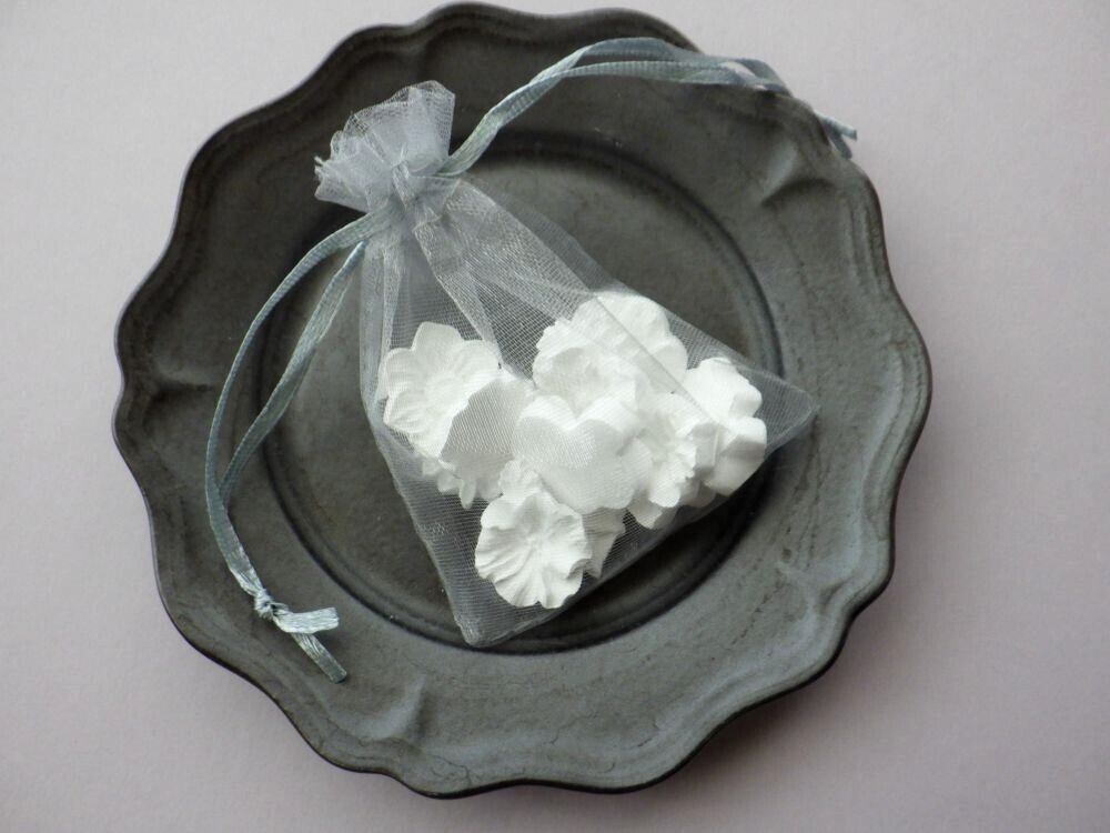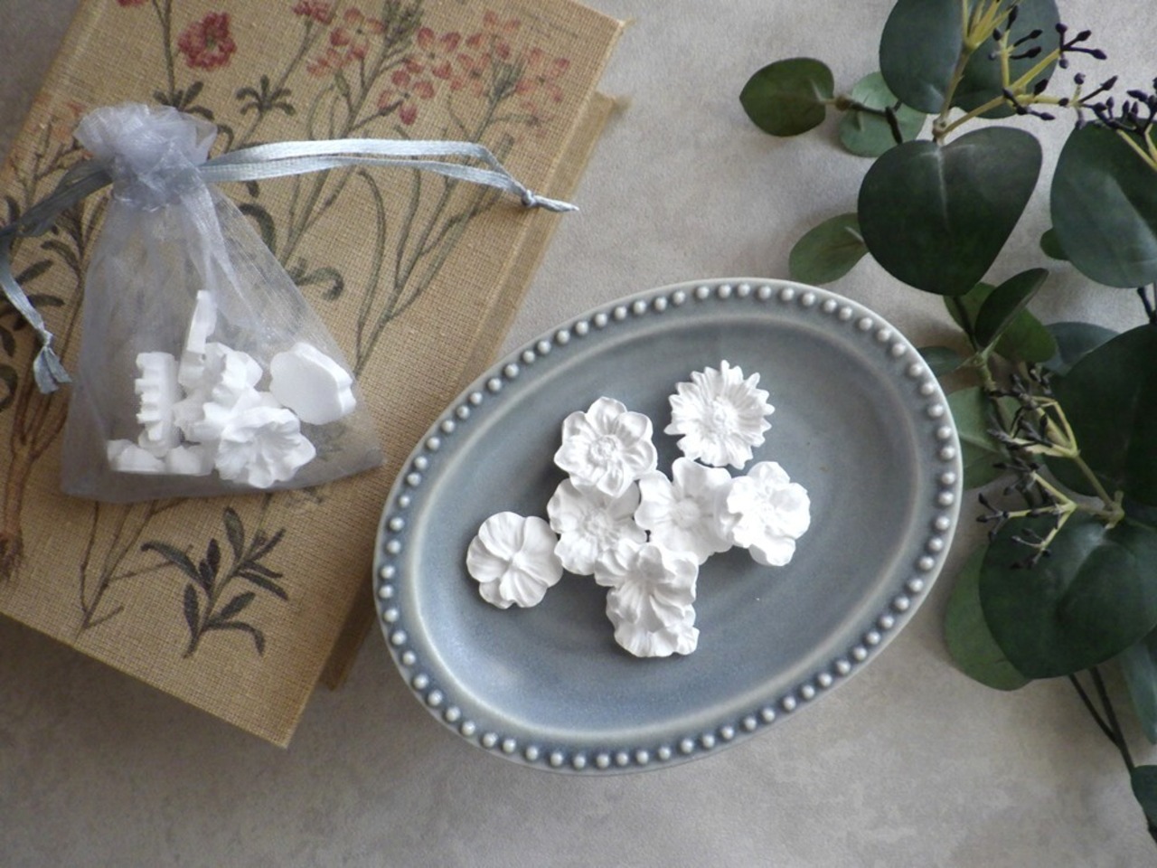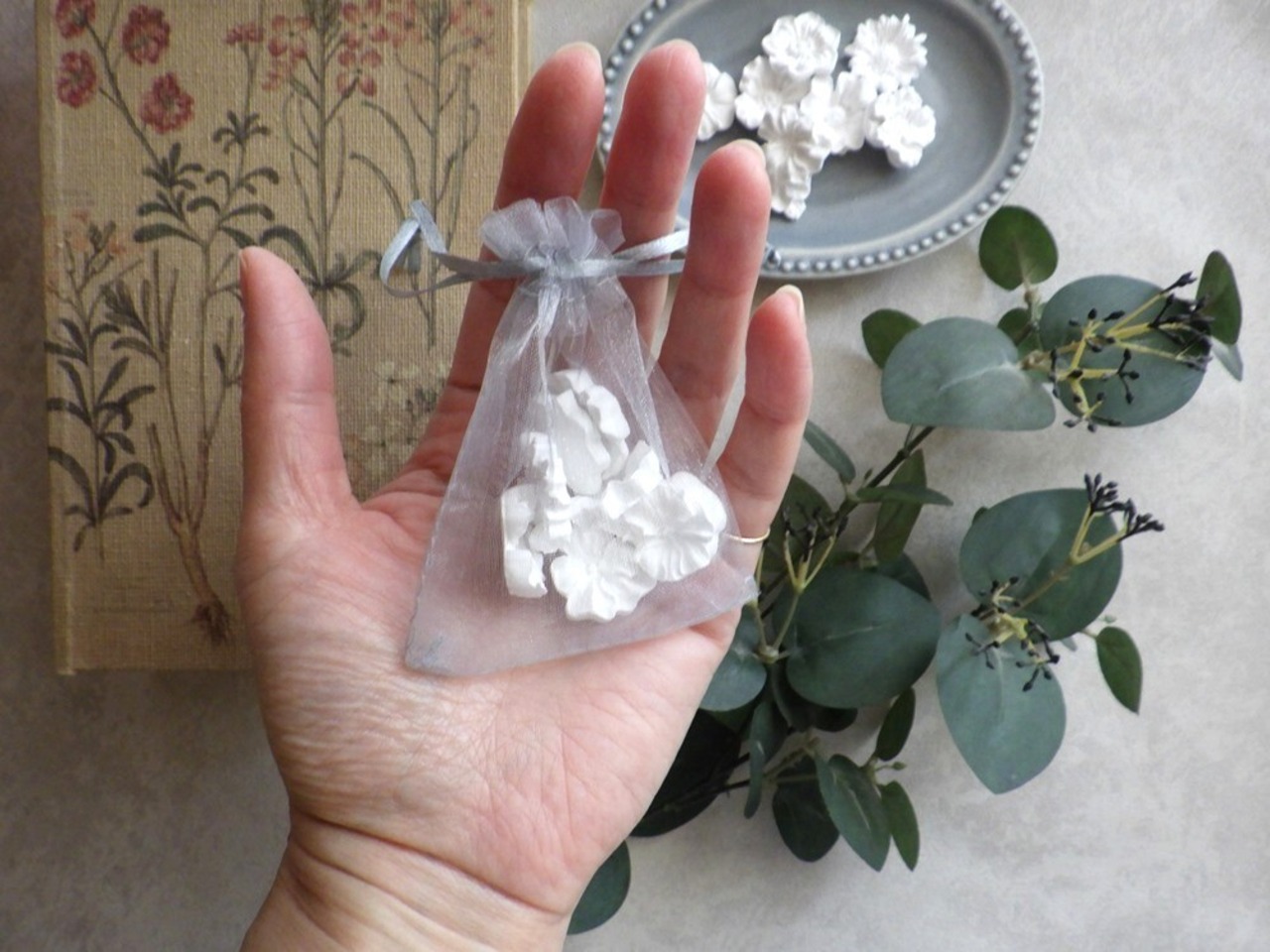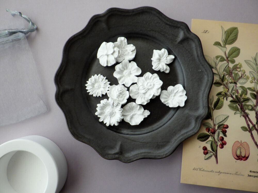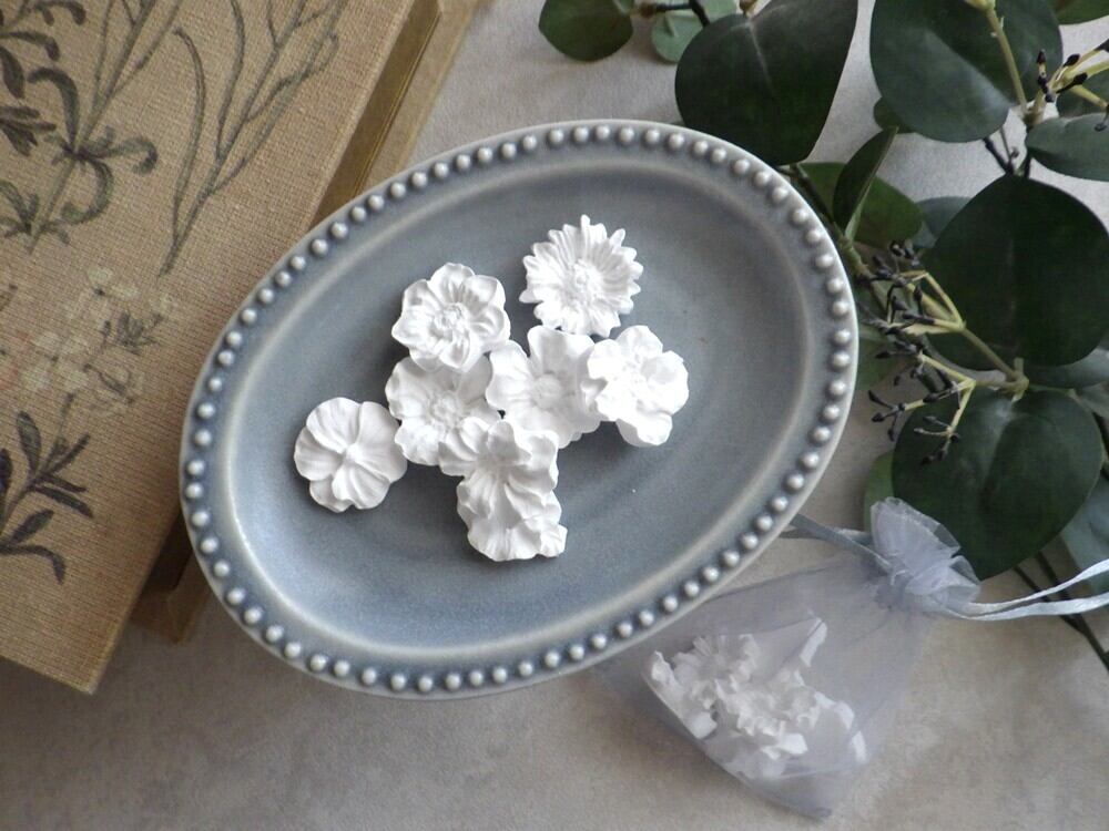 小さな花のデザインのアロマチップ、よく見ると11種類と実に豊富です。この11種類の花をひとつにまとめて、オーガンジー巾着に入れてお届けです。