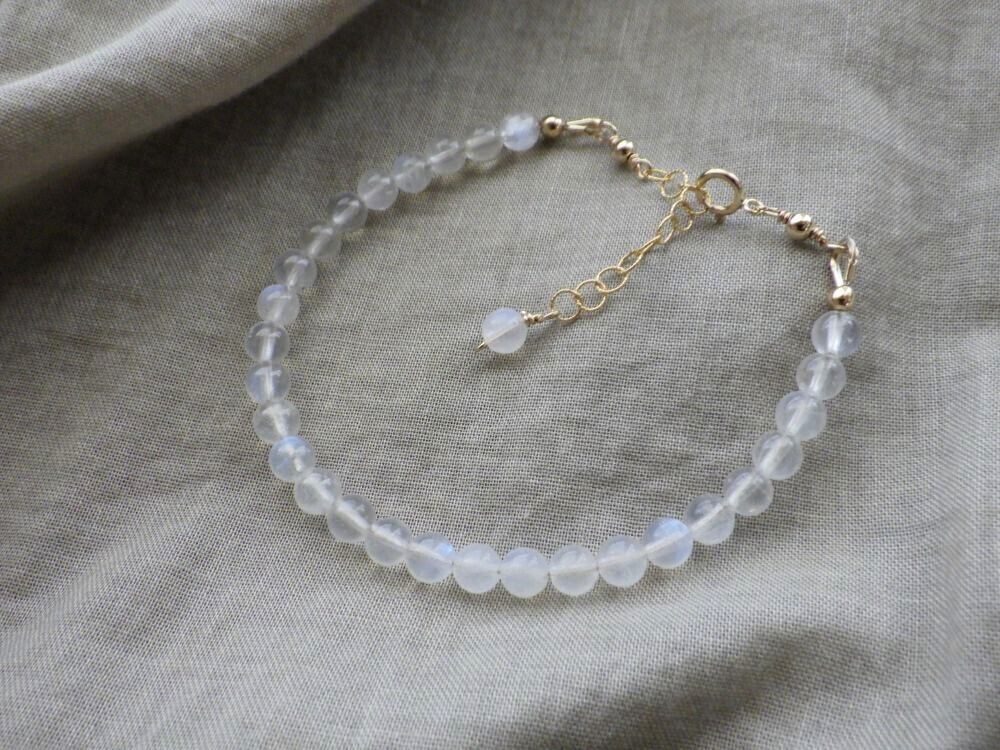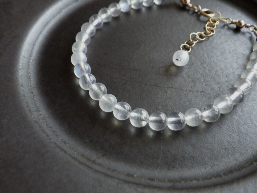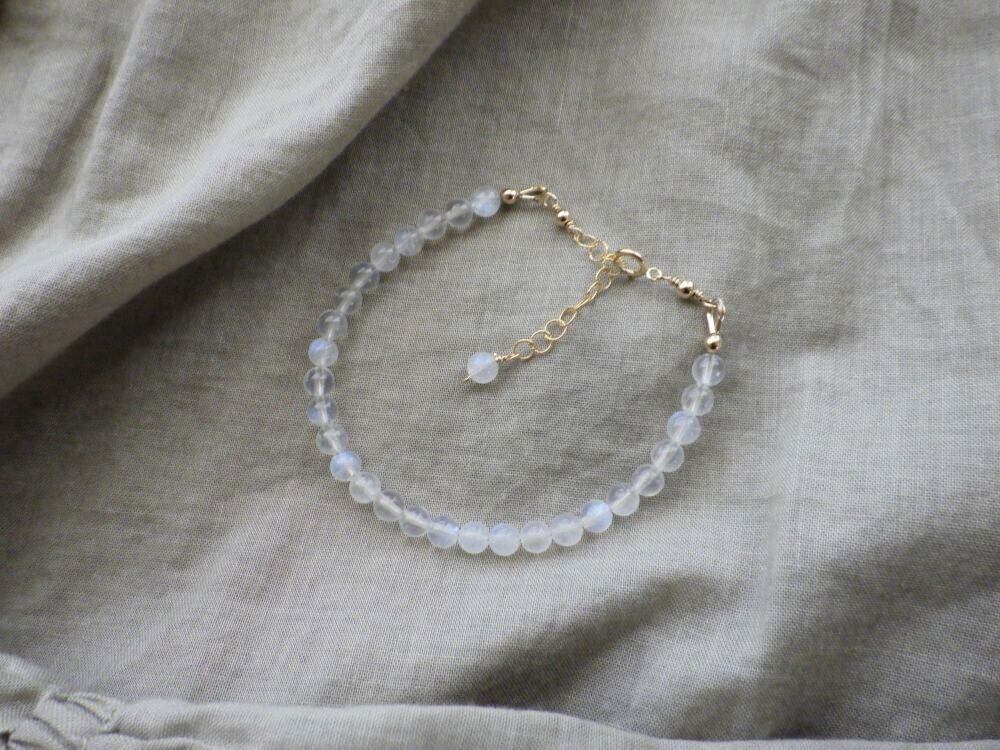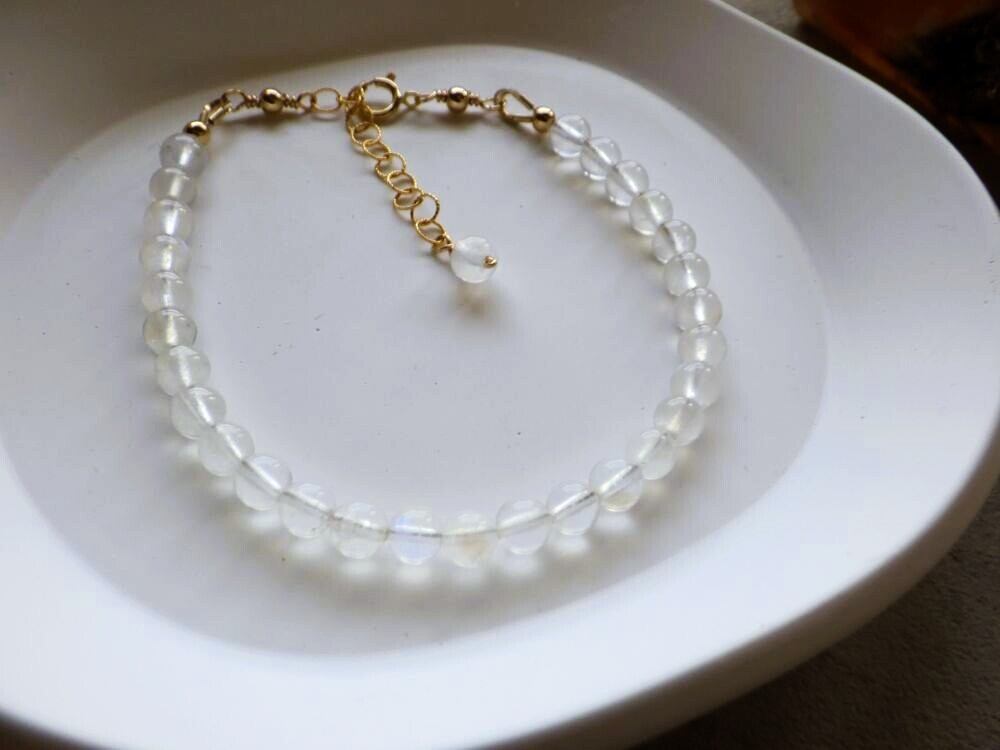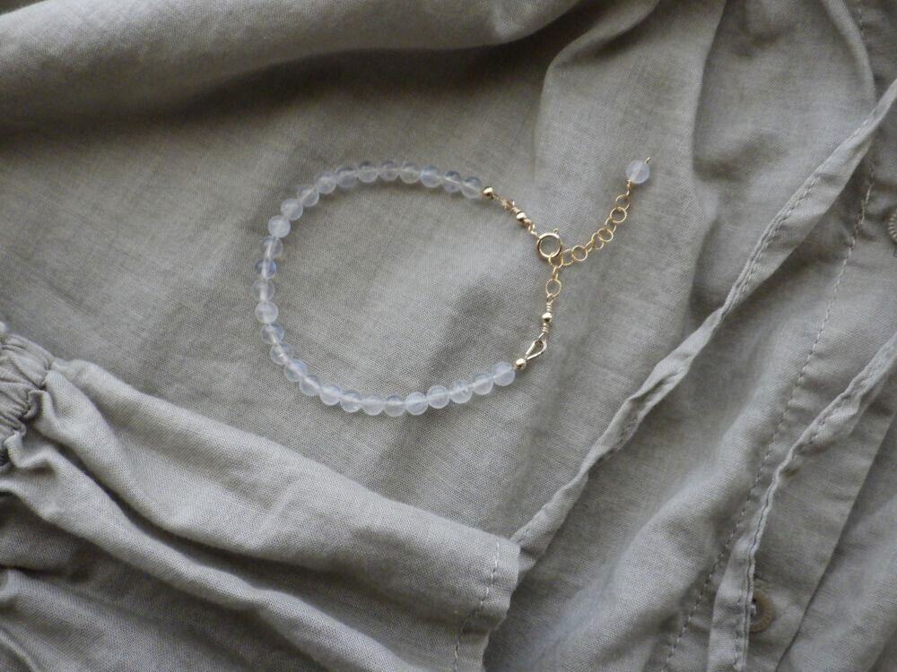 ホワイトラブラドライトの丸玉を並べて、上品な雰囲気に仕立てたアクセサリー。4-4.5mm前後の絶妙にほどよいサイズの丸玉。おおげさになりすぎることなく、ほどよい存在感のあるアクセサリーです。ホワイトラブラドライトの神秘的な輝きをそっと手首に覗かせてください。ホワイトラブラドライトは別名、レインボームーンストーン。こちらの名前でのほうが地名度が高いかもしれません。