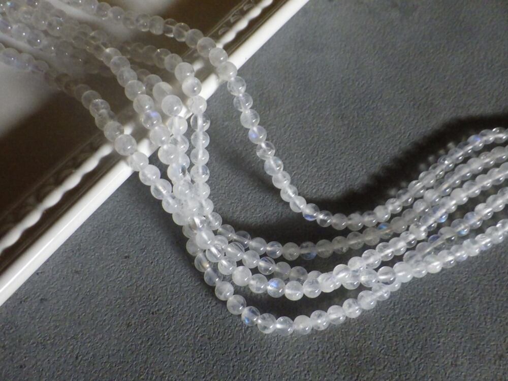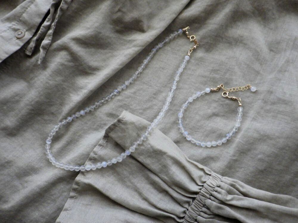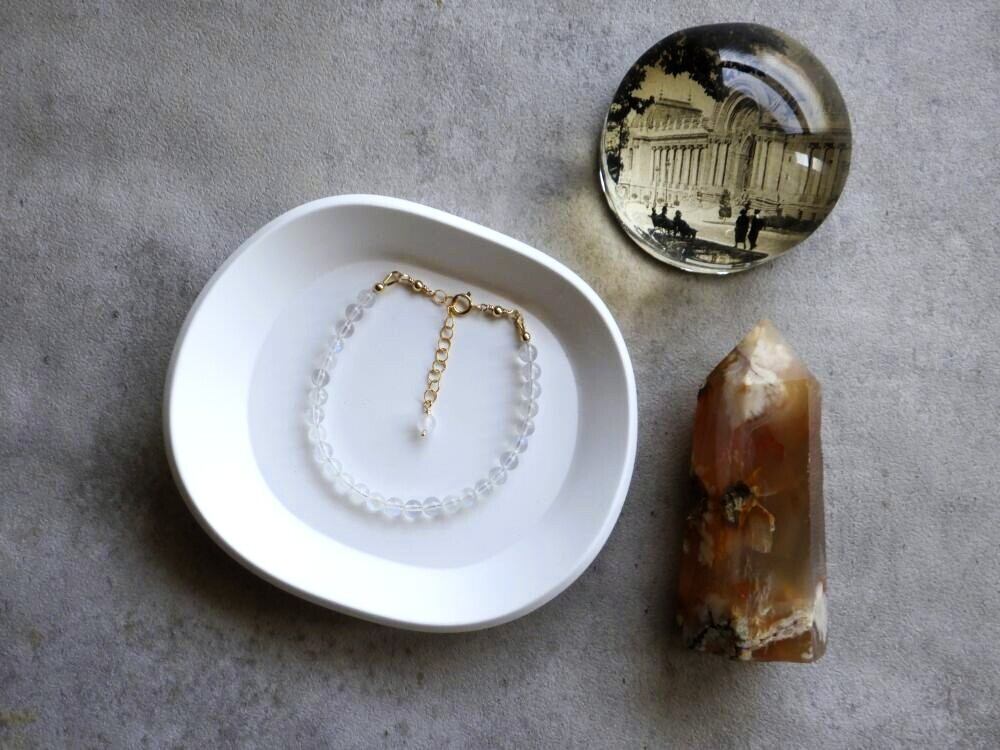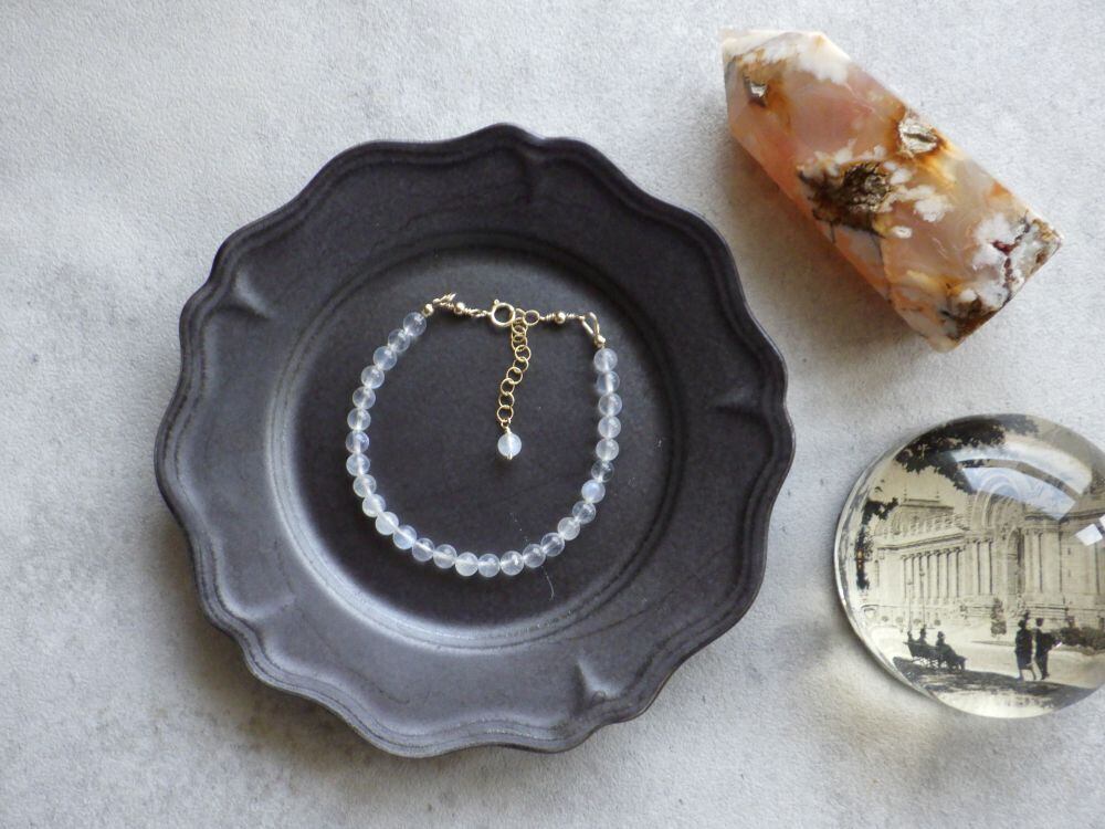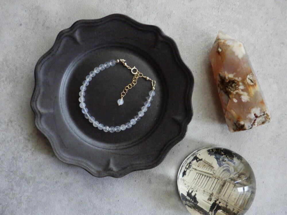 ホワイトラブラドライトの丸玉を並べて、上品な雰囲気に仕立てたアクセサリー。4-4.5mm前後の絶妙にほどよいサイズの丸玉。おおげさになりすぎることなく、ほどよい存在感のあるアクセサリーです。ホワイトラブラドライトの神秘的な輝きをそっと手首に覗かせてください。ホワイトラブラドライトは別名、レインボームーンストーン。こちらの名前でのほうが地名度が高いかもしれません。