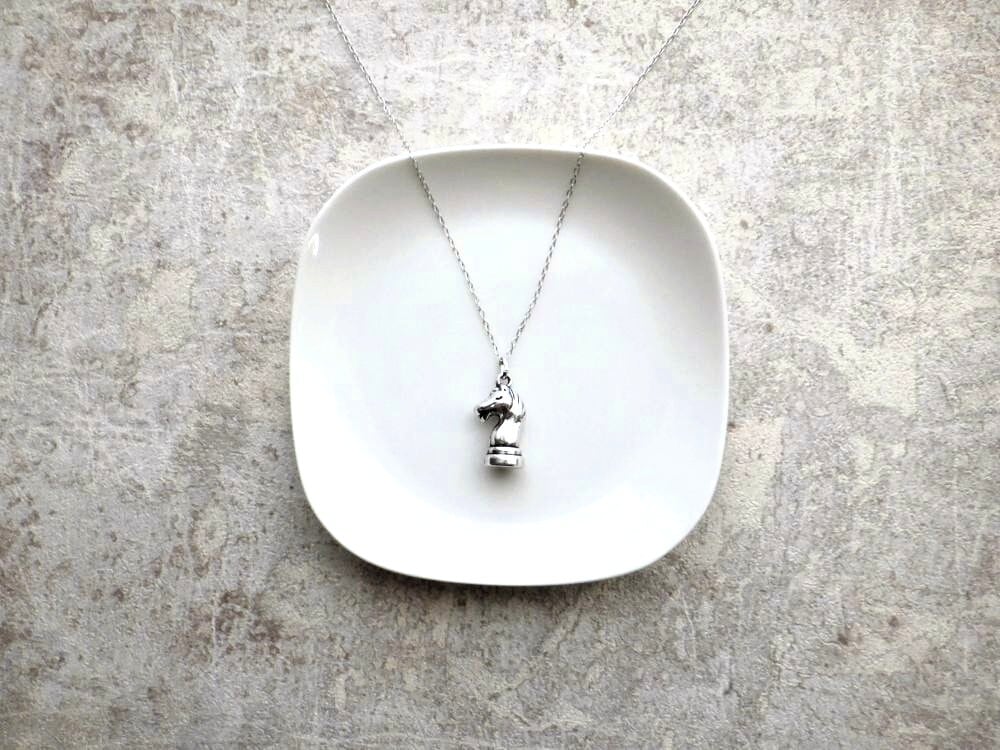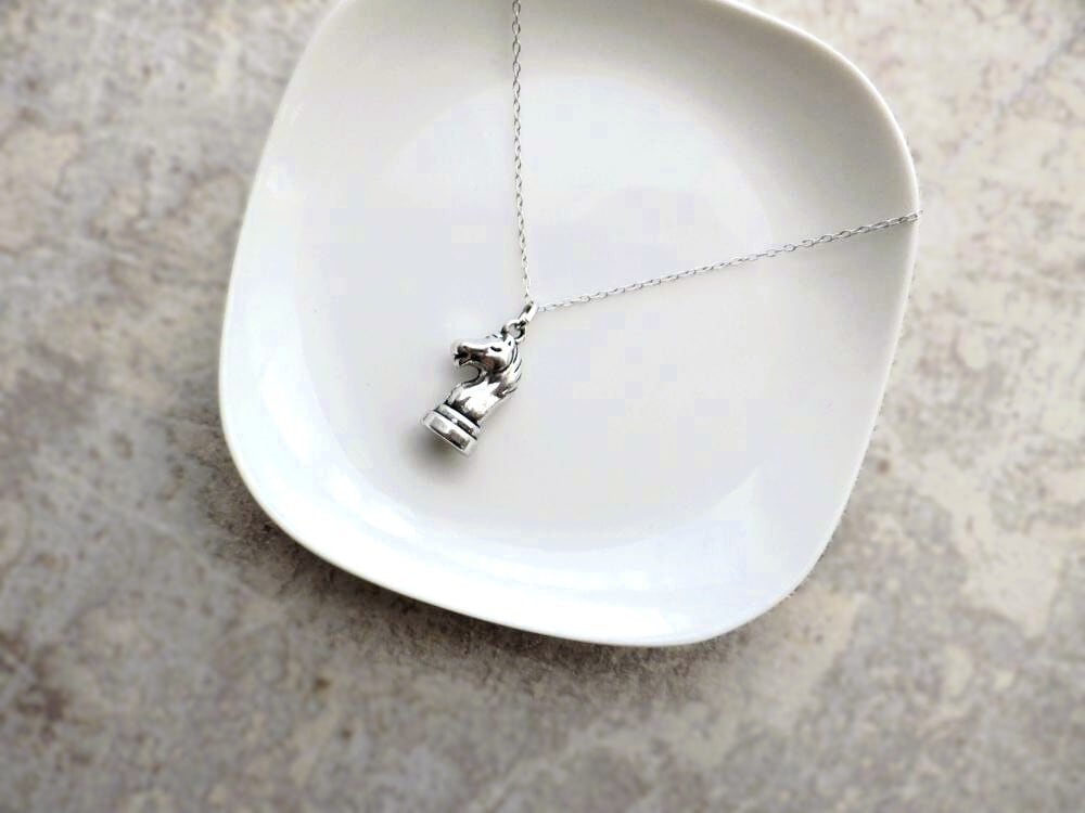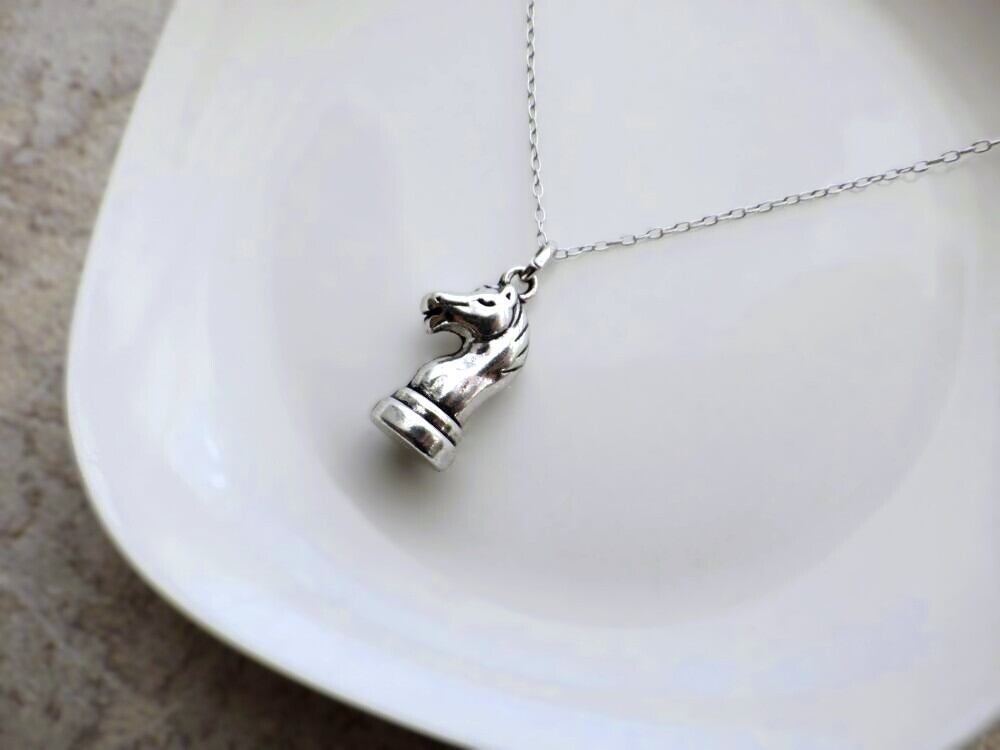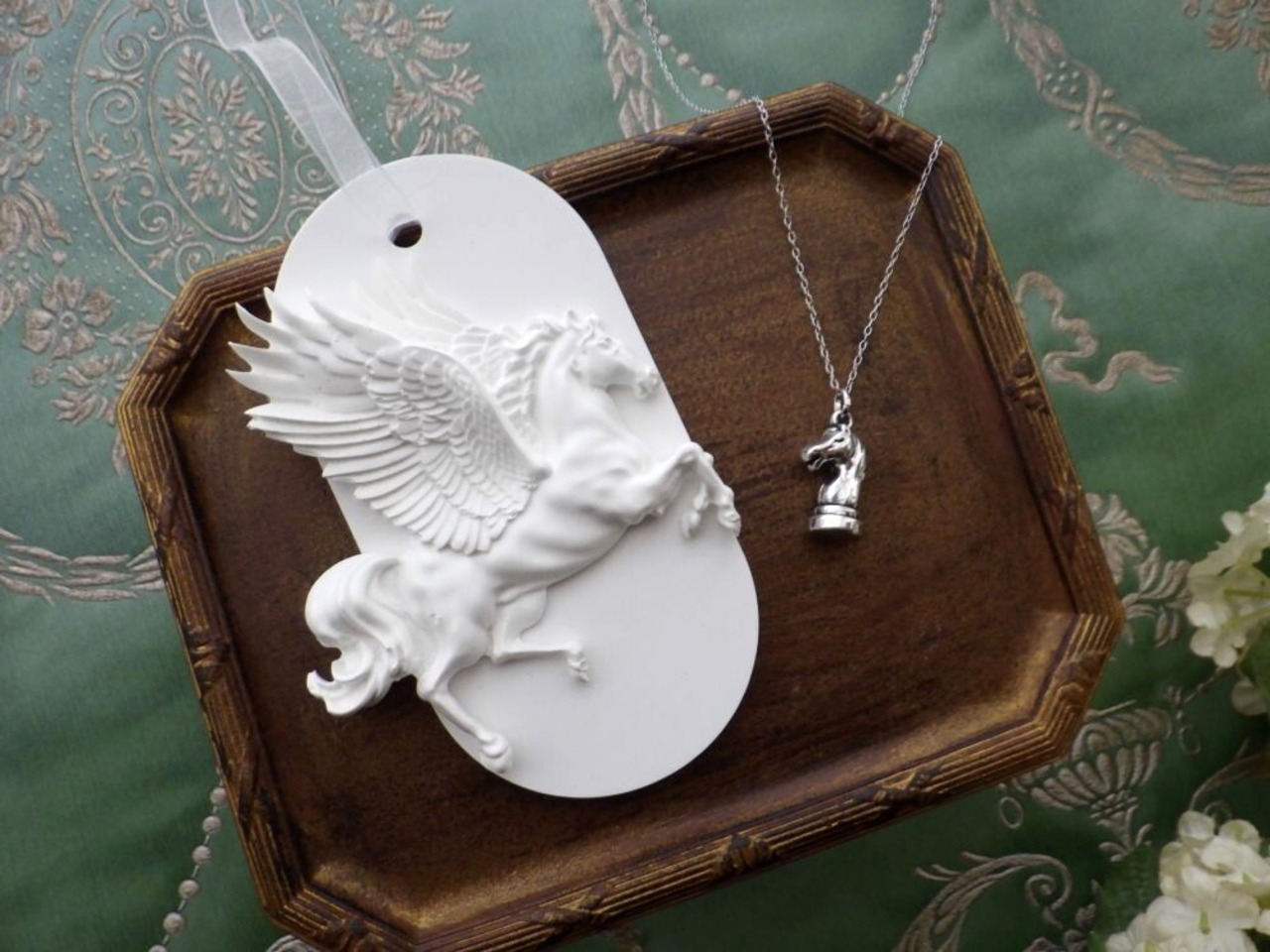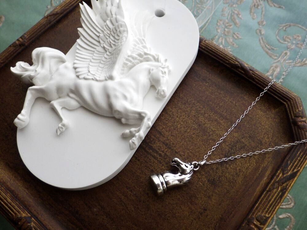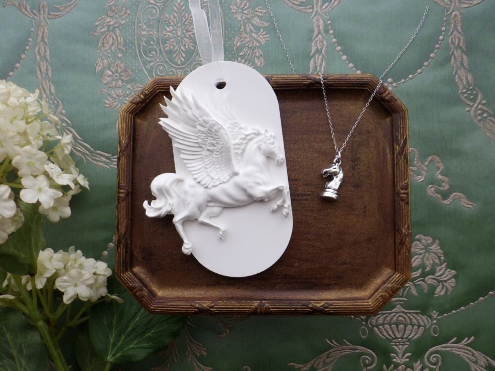 聖なる珍獣、神獣であるペガサスが空を駆け上がる姿をモチーフにした、シンプルでありつつ上品で繊細な仕上がりのアロマストーン製のオーナメント。それに合わせたのは、馬の頭部のデザイン、チェスの駒のひとつであるナイト(騎士)のペンダントネックレス。