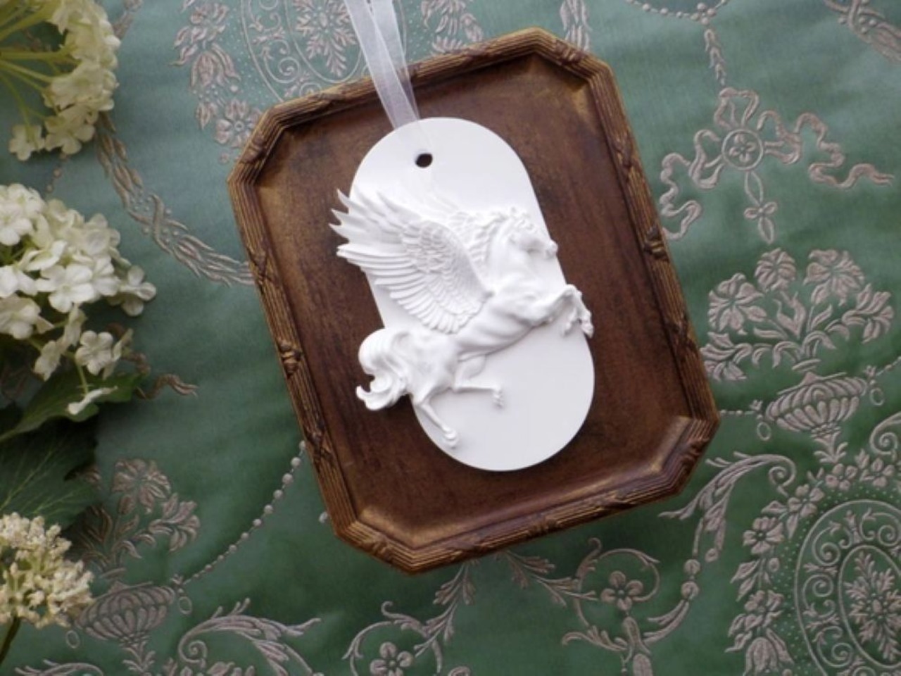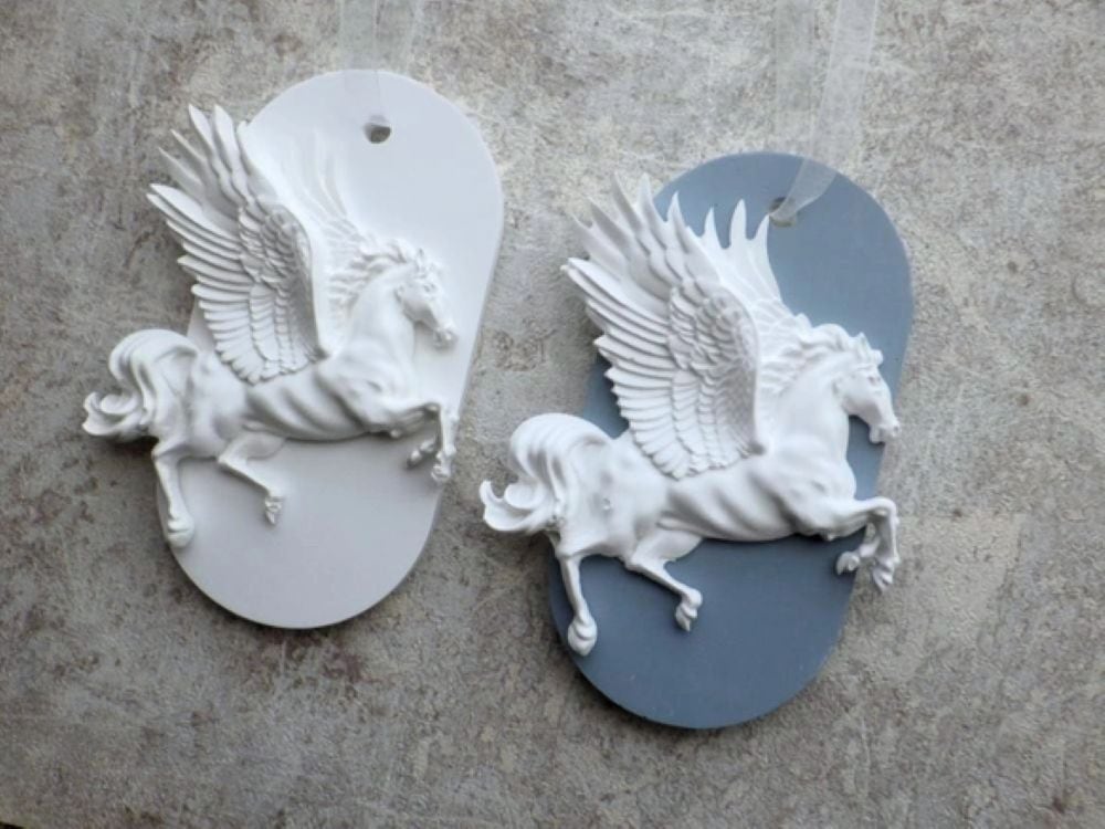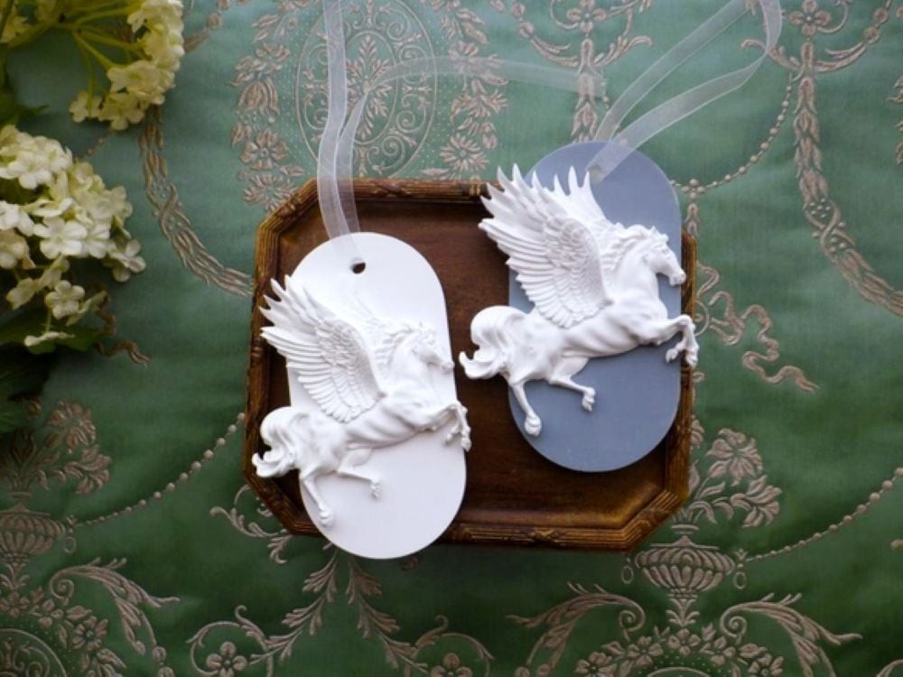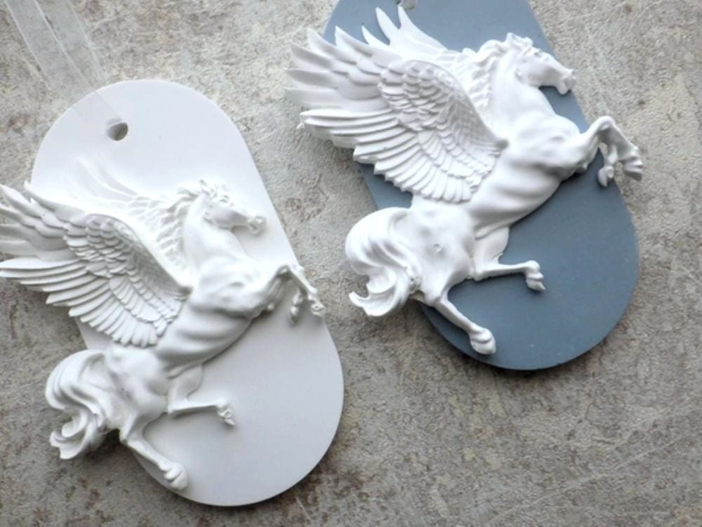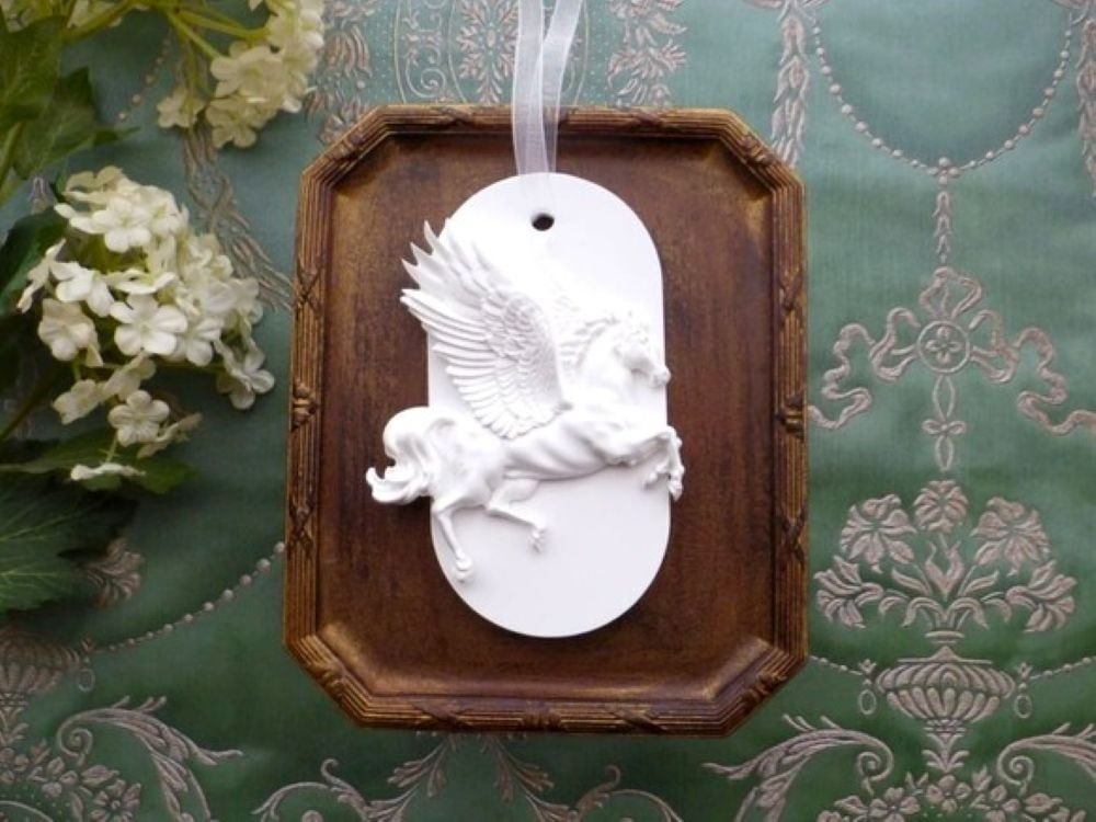 聖なる珍獣、神獣であるペガサスが空を駆け上がる姿をモチーフにした、シンプルでありつつ上品で繊細な仕上がりのアロマストーン製のオーナメント。