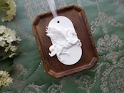オーナメントは土台の色をホワイト、ブルーグレー色、どちらかを選べます。無垢な真っ白いオーナメントで神聖な世界観の演出に活用ください。また、落ち着きのあるブルーグレー色の背景に真っ白いモチーフを合わせると、洋食器にみかけるカメオ調のデザインになり、より格式高い仕上がりとなります。