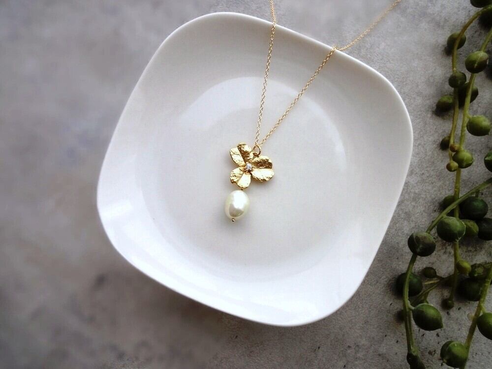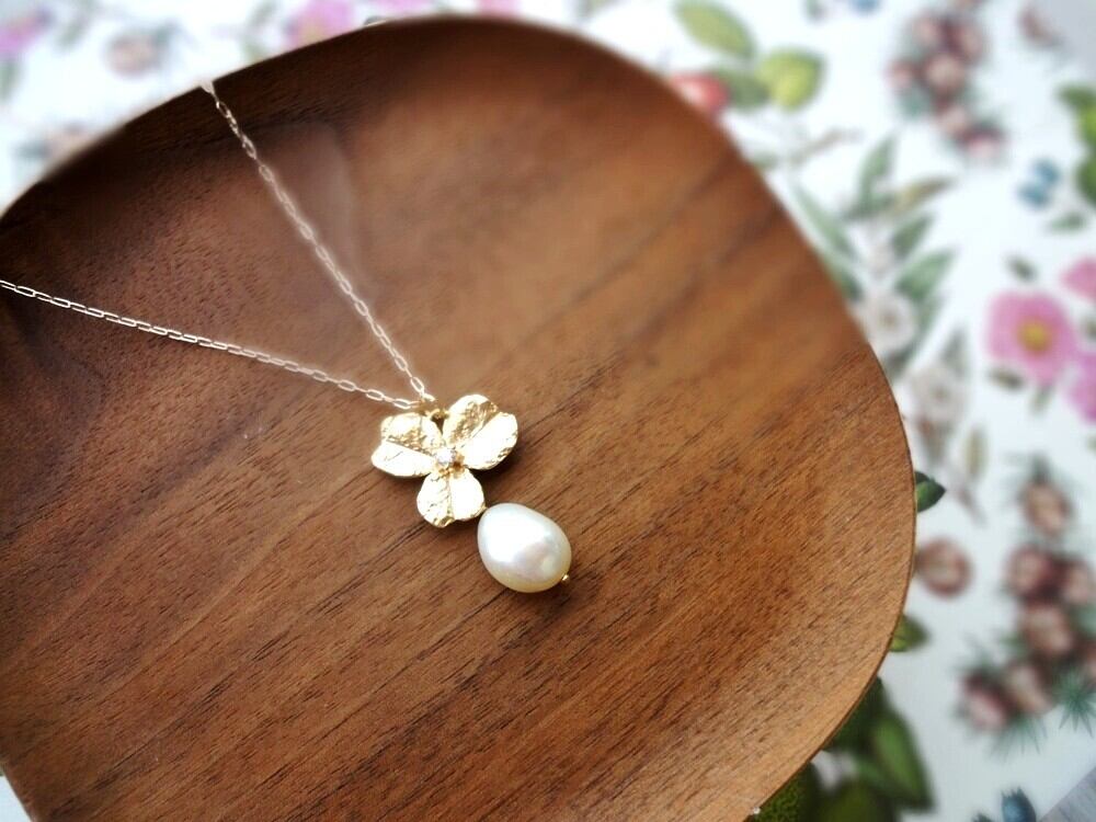 本物の三つ葉のクローバーのような、ゴールドのパーツの中央に、小さなキュービックジルコニアが輝くモチーフ。その三つ葉のクローバーに不定形の淡いグリーン色の淡水パールを一粒、合わせたペンダント。