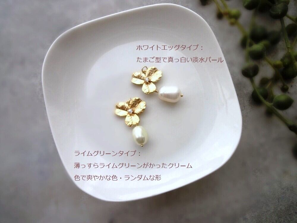 淡水パールといえばホワイトやアイボリー、クリーム色が一般的ですが、今回の使用した淡水パールは、不定形で個性的な形が楽しめるだけでなく、ほんのり淡いライムグリーン色で珍しく、クールな色あい。単調になりがちな淡水パールにはない、新鮮な雰囲気があります。