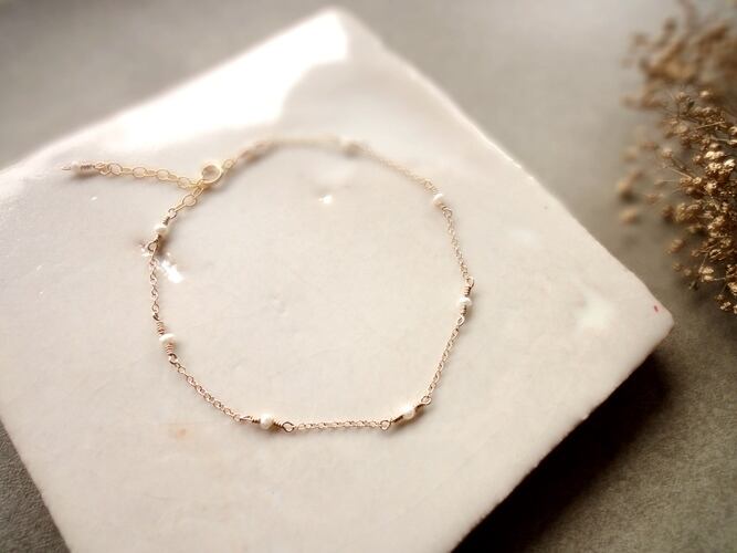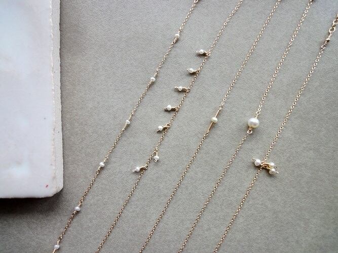 極小サイズの淡水パールと小豆チェーンをリズミカルにつなげた、ステーションデザイン。