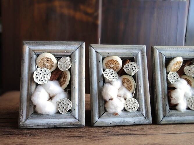 ■素材■ 箱:木製 ドライ:綿の実、レモン、シナモンスティック、蓮の実