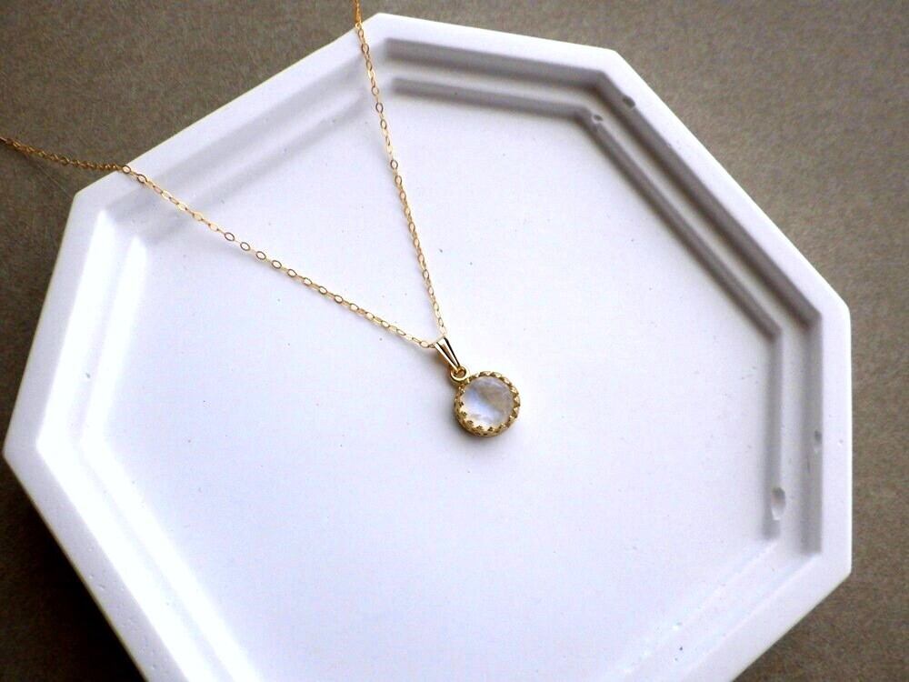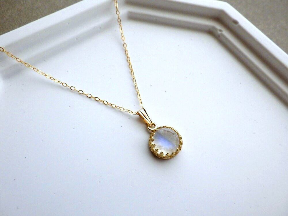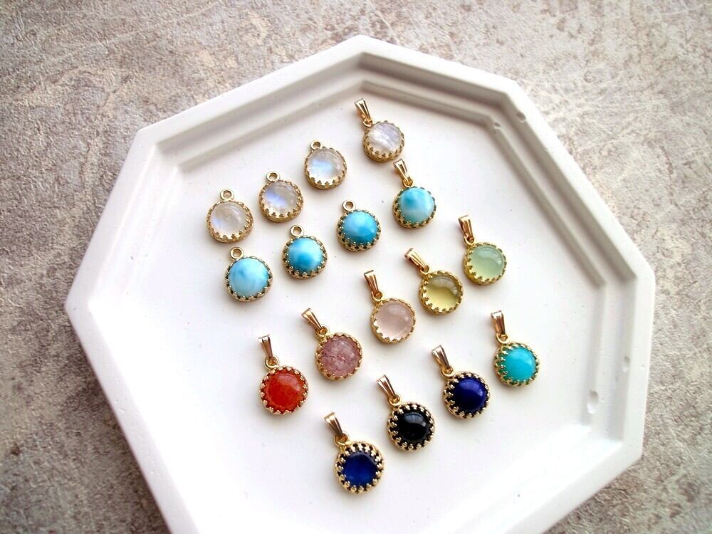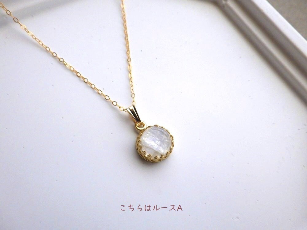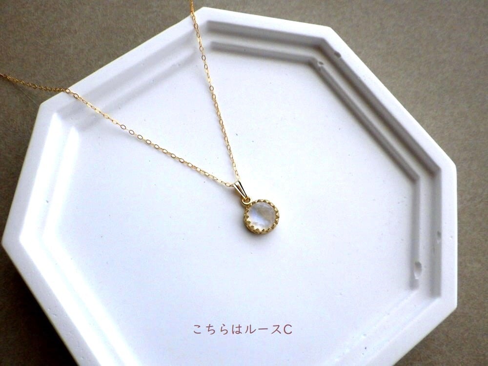 別名「レインボームーンストーン」とも呼ばれるこの石は、満月の夜に優しく降り注ぐ光を思わせる神秘的な美しさで、心を静かに満たしてくれます。直径約8mmの天然石のカボションを、繊細な透かし模様の真鍮枠で優しく包み込みました。光の角度が変わるたび、青や緑、淡い虹色の輝きがさりげなく浮かび上がり、控えめながらも深い存在感を放ちます。