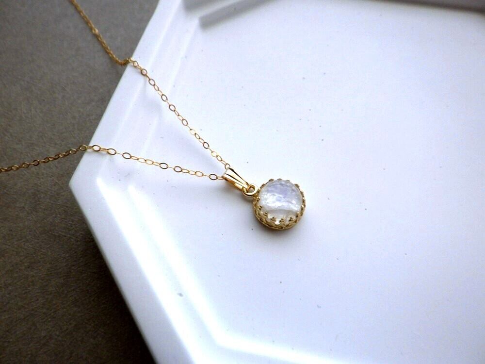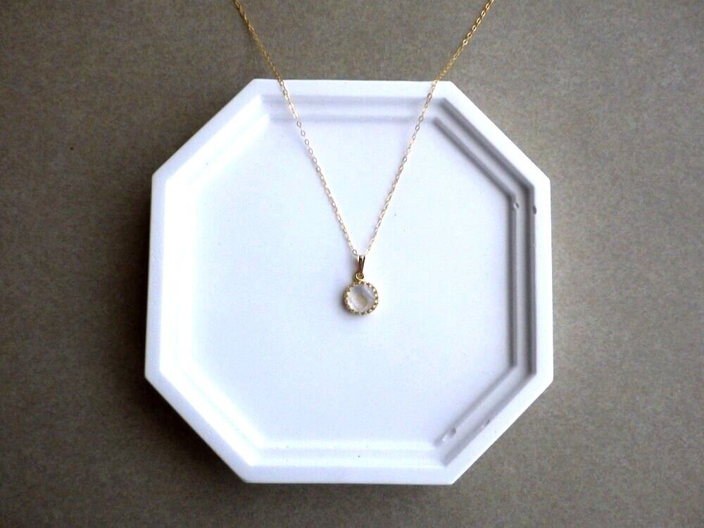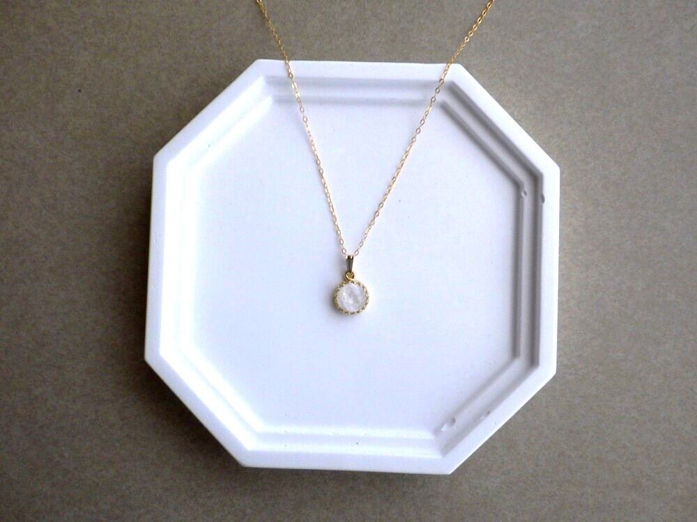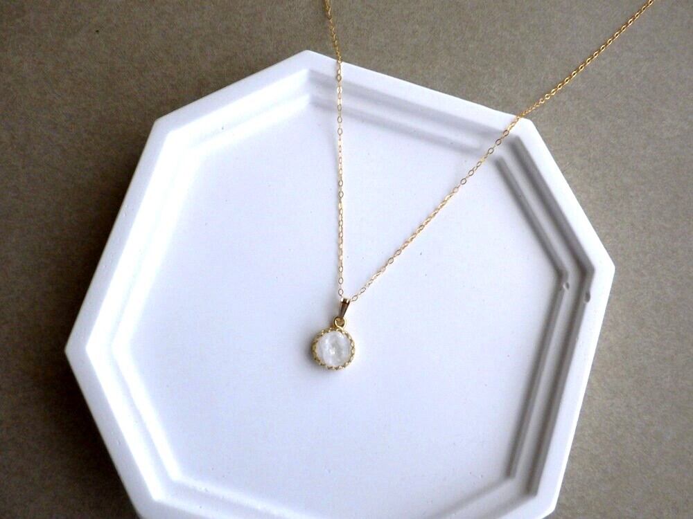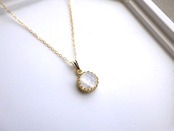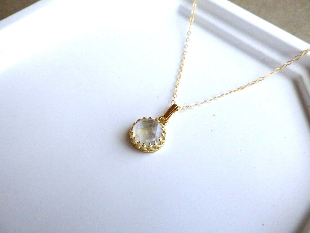 透明感のある白い石の中に、柔らかく揺らめく虹色のシラーが浮かぶ、ホワイトラブラドライト。そのホワイトラブラドライトで小さなペンダントネックレスをご用意しました。