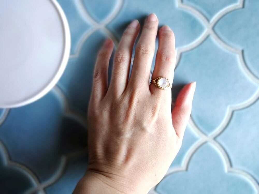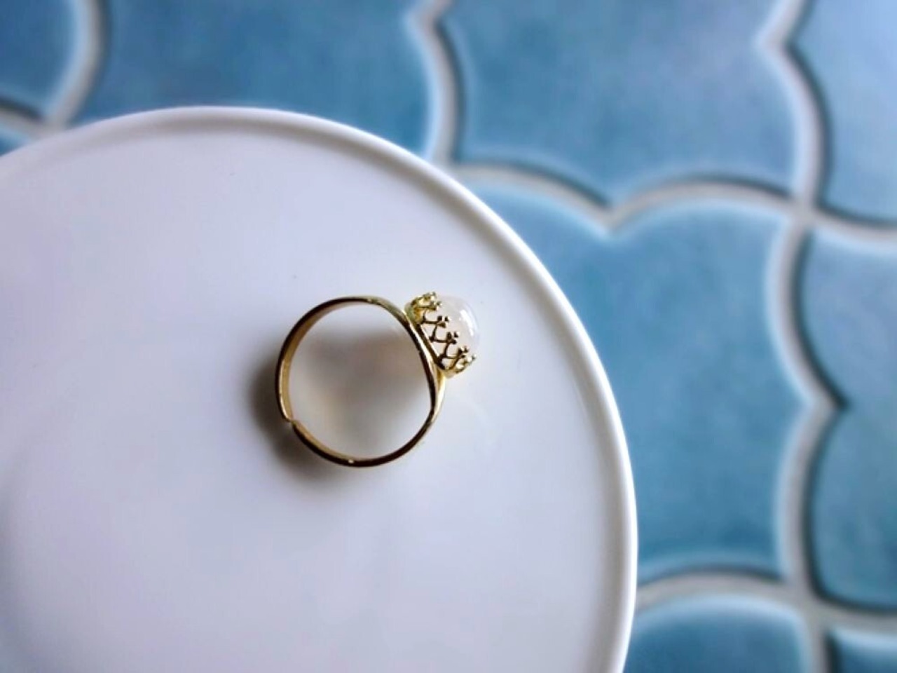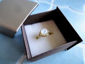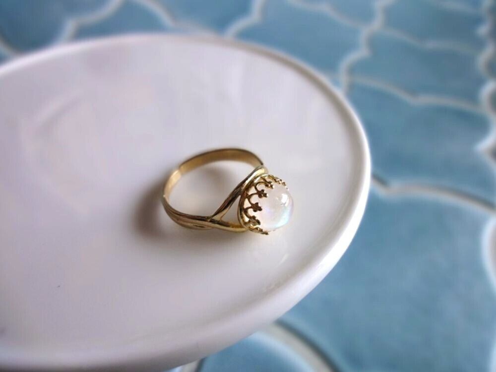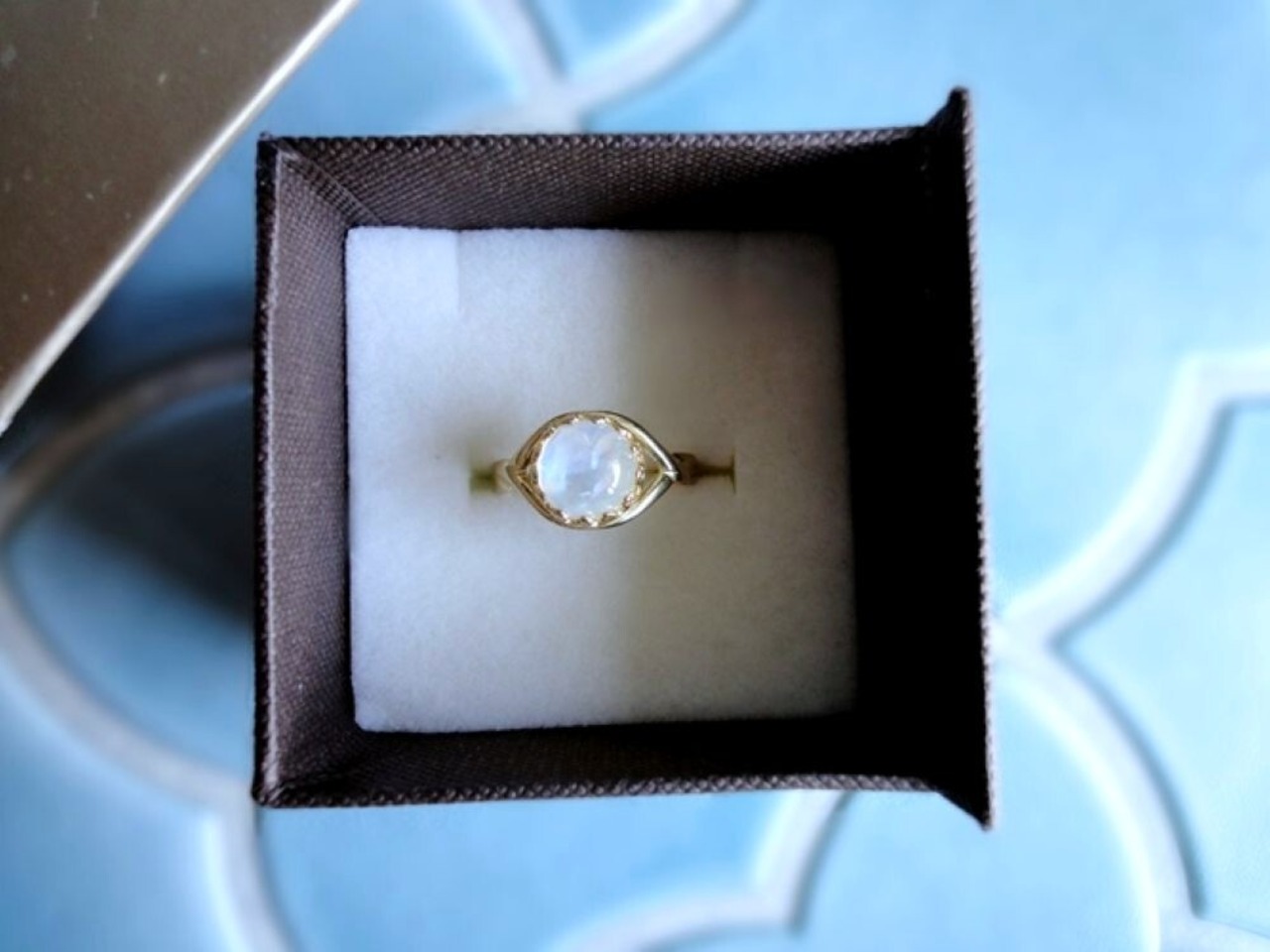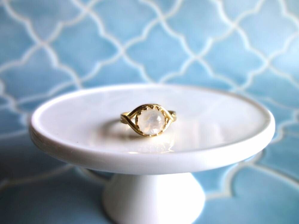 直径約8mmの天然石のカボションを、繊細な透かし模様の真鍮枠で優しく包み込みました。今回はゴールド色の指輪でご用意しました。小さな箱に入れてお届けします。