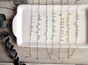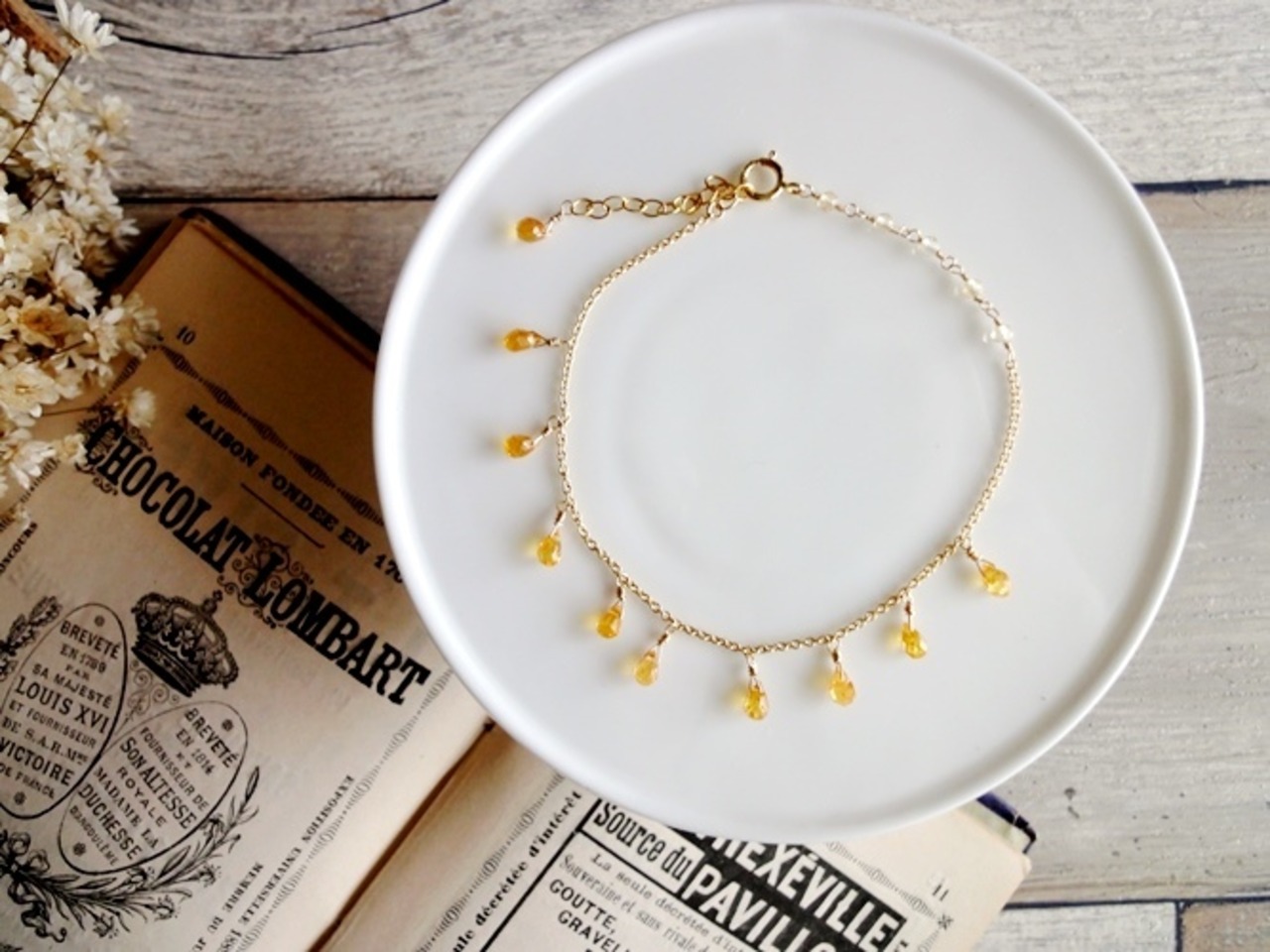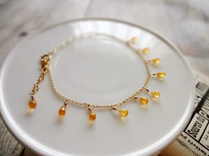 ゴールドフィルド製のチェーンに極小の天然石のドロップを丁寧につなげぶら下げました。チェーンの延長線上に天然石の粒をつなげ、留め具と連結しました。ブレスレットの着脱の際にも、天然石の美しさを味わうことができるデザインです。