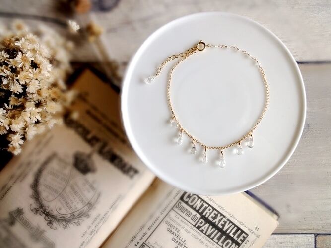 ゴールドフィルド製のチェーンに極小の天然石のドロップを丁寧につなげぶら下げました。チェーンの延長線上に天然石の粒をつなげ、留め具と連結しました。ブレスレットの着脱の際にも、天然石の美しさを味わうことができるデザインです。