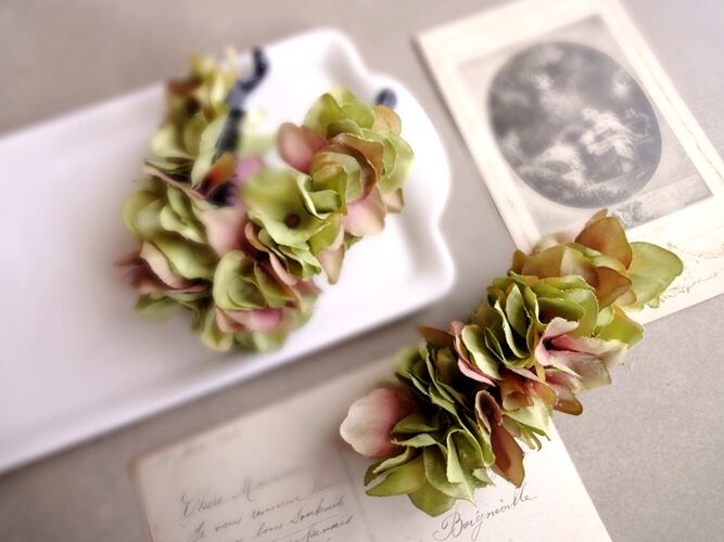 ややカーキ色を帯びたグリーン色がベースとなっている。部分的にモーブ・くすんだピンク色のグラデーションが見られたり、モーブ色ベースの花びらも混合している。紅葉始めたグリーン色の紫陽花が再現されている。