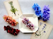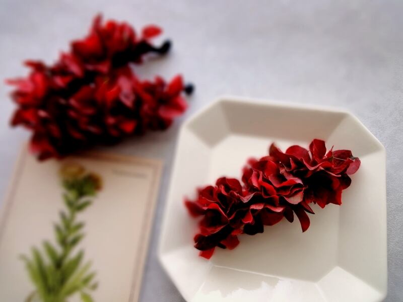 ひらひらと花びらが集まったような紫陽花。そんな花びらでバレッタをご用意しました。しっかり止まるバレッタで手軽に楽しめるヘアーアクセサリーです。小さな箱に入れてお届けします。