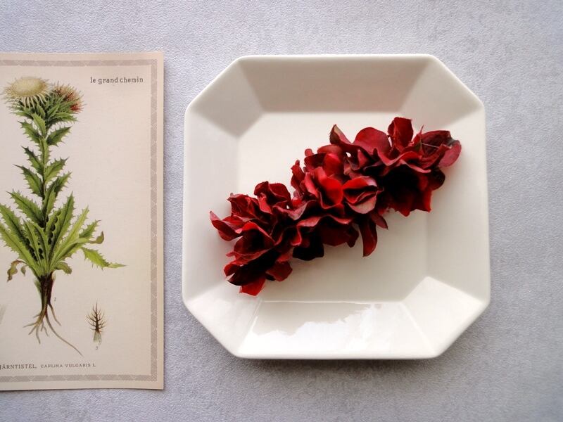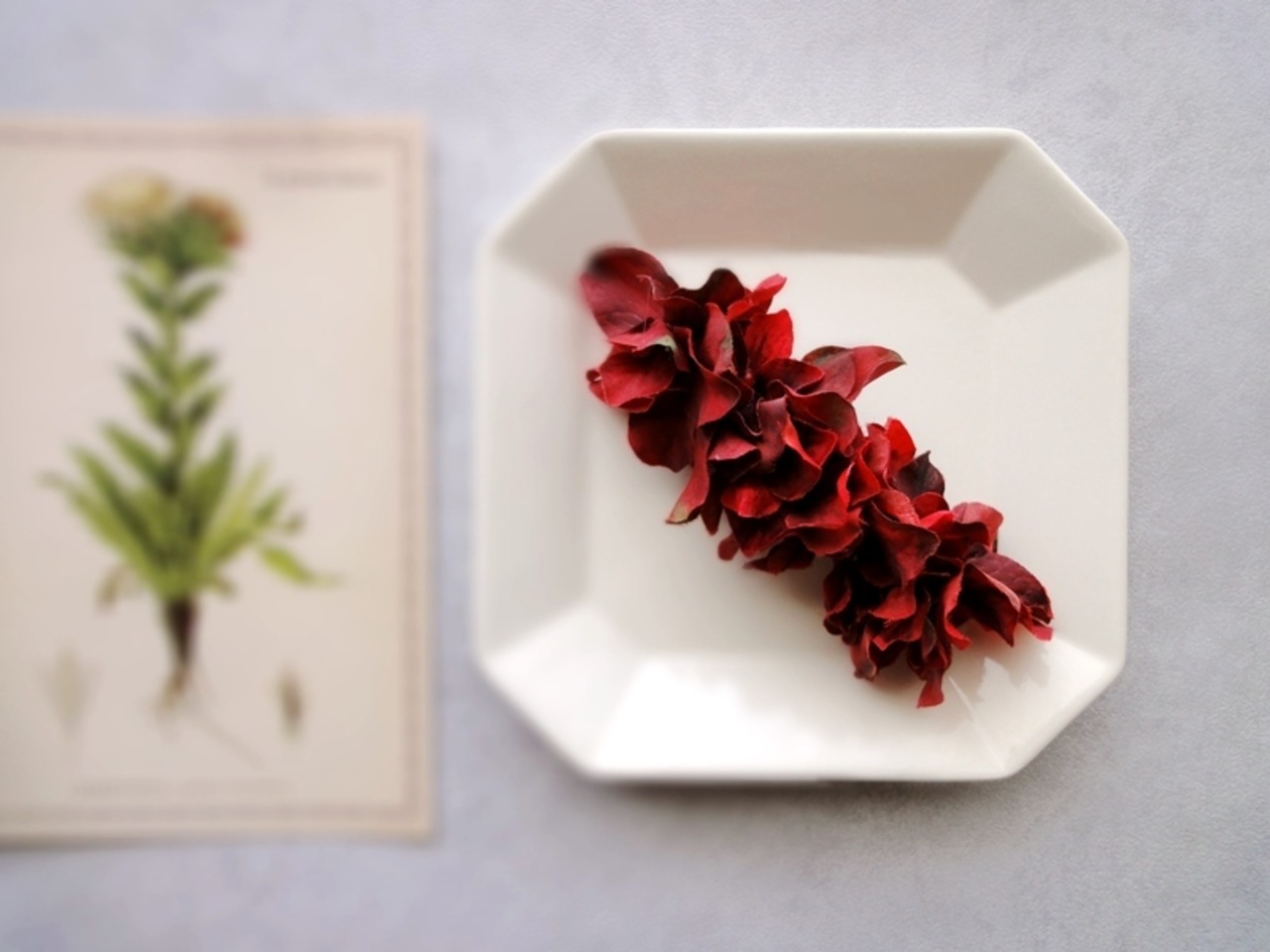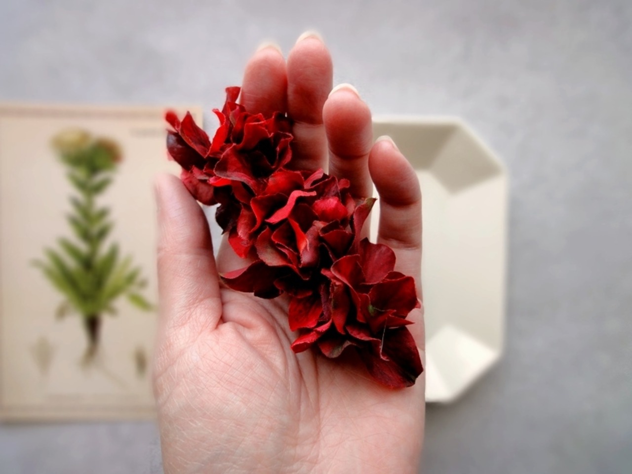 ■色の特徴■ レッドは燃えるような赤、深紅色。ダークレッドに滲む部分があり重厚な雰囲気も垣間見えます。花びらのしわ加工や陰影の加減で色の深みが増して見えたりと表情が鮮やかです。