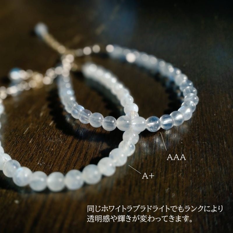 ホワイトラブラドライトの丸玉を並べて、上品な雰囲気に仕立てたアクセサリー。5-5.5mm前後の絶妙にほどよいサイズの丸玉。おおげさになりすぎることなく、ほどよい存在感のあるアクセサリーです。ホワイトラブラドライトの神秘的な輝きをそっとデコルテに覗かせてください。ホワイトラブラドライトは別名、レインボームーンストーン。こちらの名前でのほうが地名度が高いかもしれません。