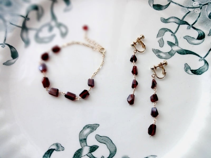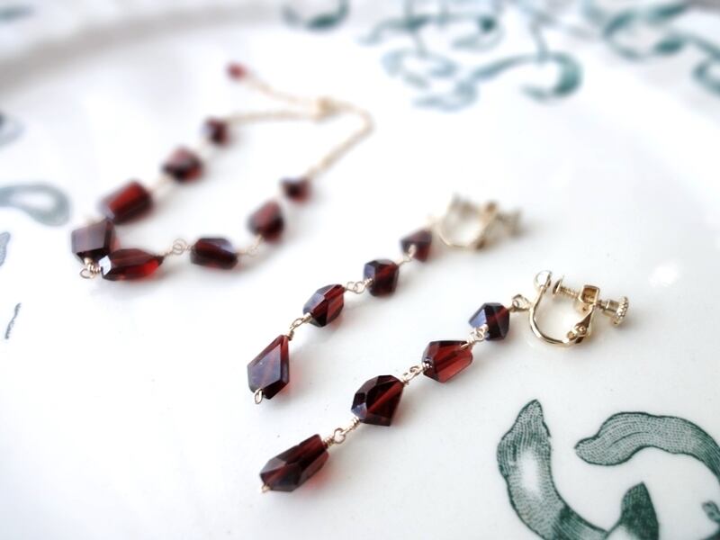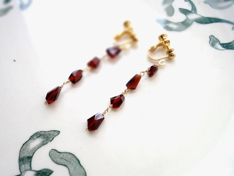 4石ずつの天然石を14KGF製ワイヤーでつなげて、耳飾りに仕上げました。