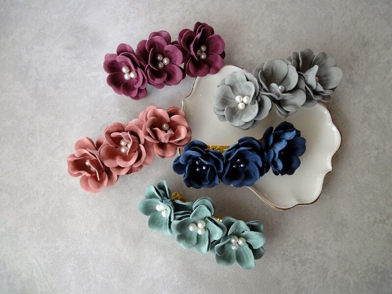 秋冬の洋服に合わせやすい、スモーキーカラーの花モチーフのバレッタ。