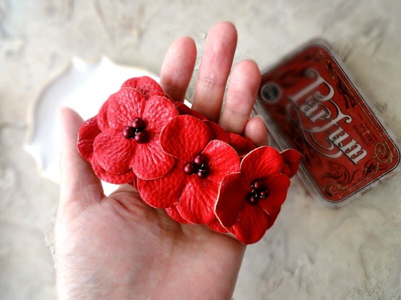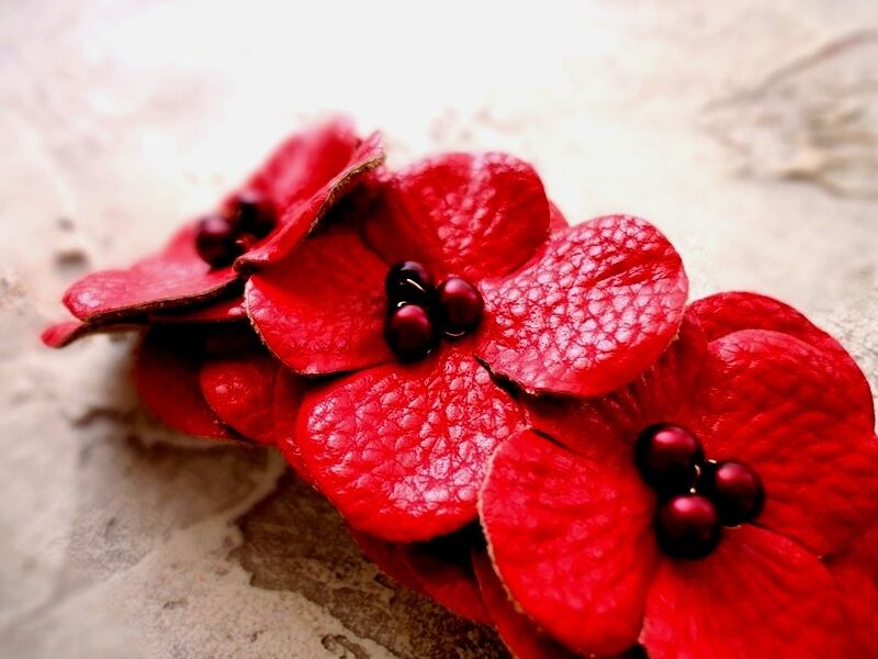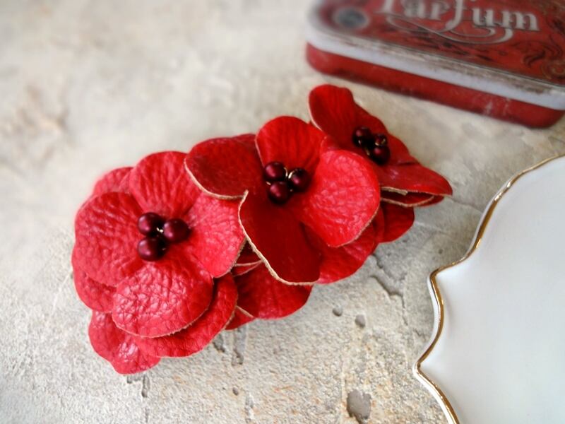 まるでペンキをレザーに塗ったような、強い発色で鮮やかな花びら。その花芯にガラスパールを見立ててワイヤーで仕立てた、バレッタです。