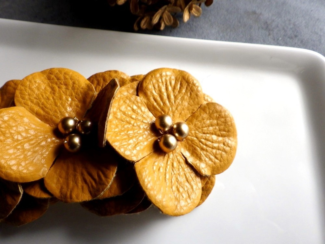まるでペンキをレザーに塗ったような、強い発色で鮮やかな花びら。その花芯にガラスパールを見立ててワイヤーで仕立てた、バレッタです。