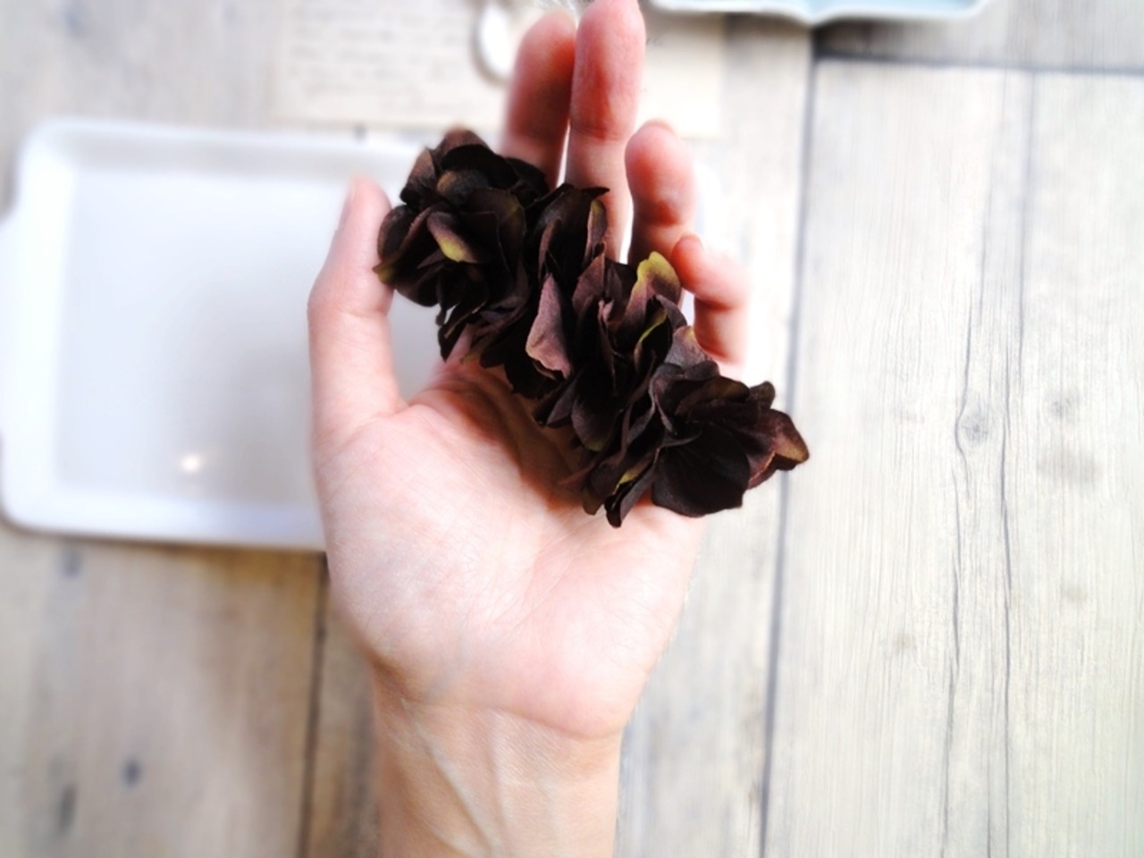 美味しそうなチョコレートを思わせる濃厚チョコレートのブラウン色。カーキ色のグラデーションがかかっているので色に深みが出ている。色が単一であるおかげで花びらの葉脈のしわ加工が美しく見えて、細やかな表情が美しい。