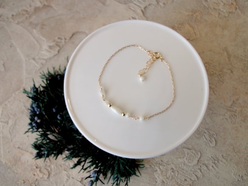 お米、ライスの形をした天然石のブレスレットシリーズ。神聖な穀物の豊授のブレスレット。長小豆チェーンにライスの形の天然石をつなげた、繊細で軽やかなデザイン。ライスの形の天然石を中央に配したデザインには、いくつかのこだわりが隠されています。