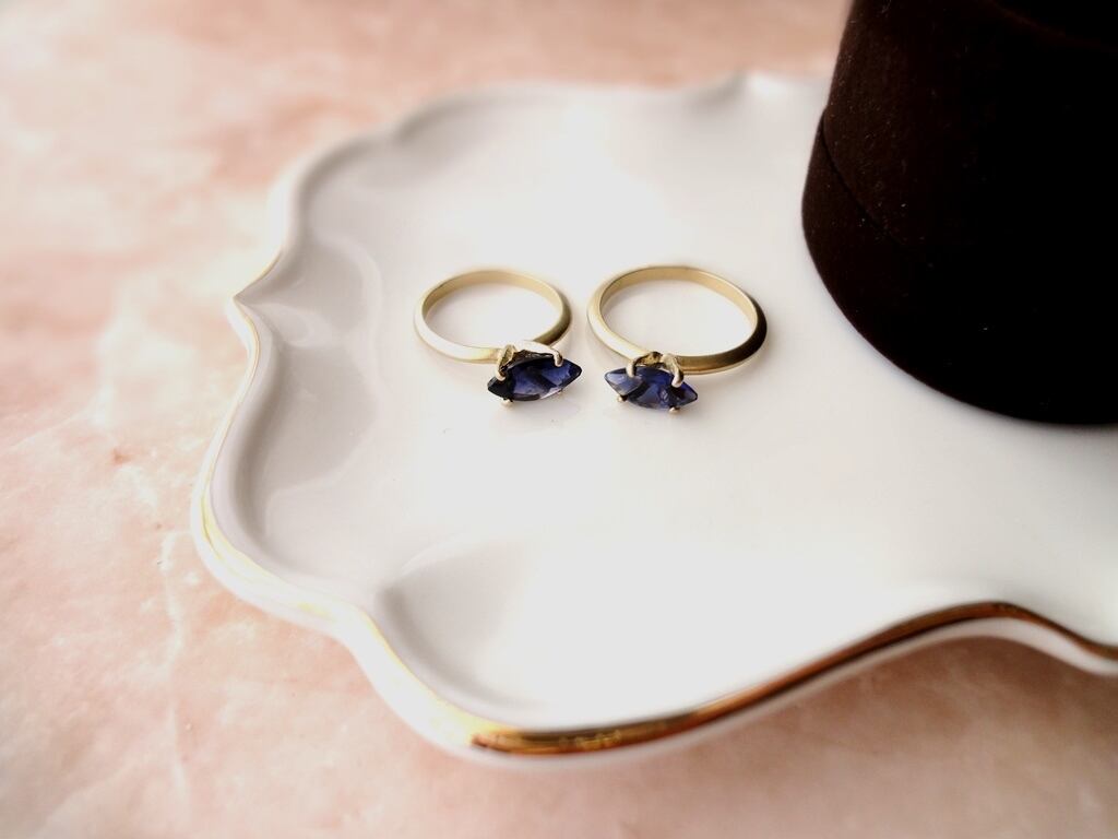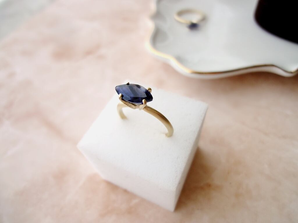 小さなマーキスの指輪。指輪の金具部分はマットゴールド色でマーキスの形のシャープな印象をやわらげ、全体のバランスを整えました。