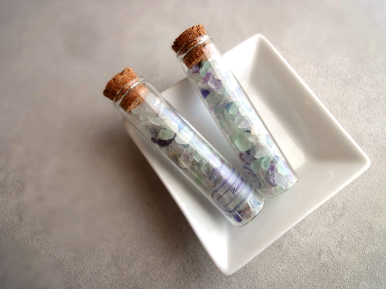 細長いガラスの小瓶に、フローライトのさざれ石を入れてお届けします。