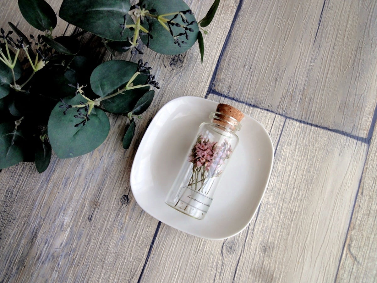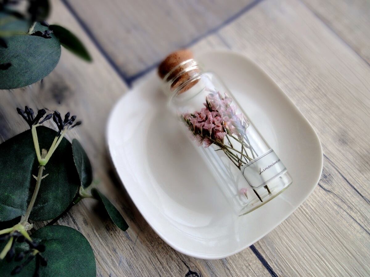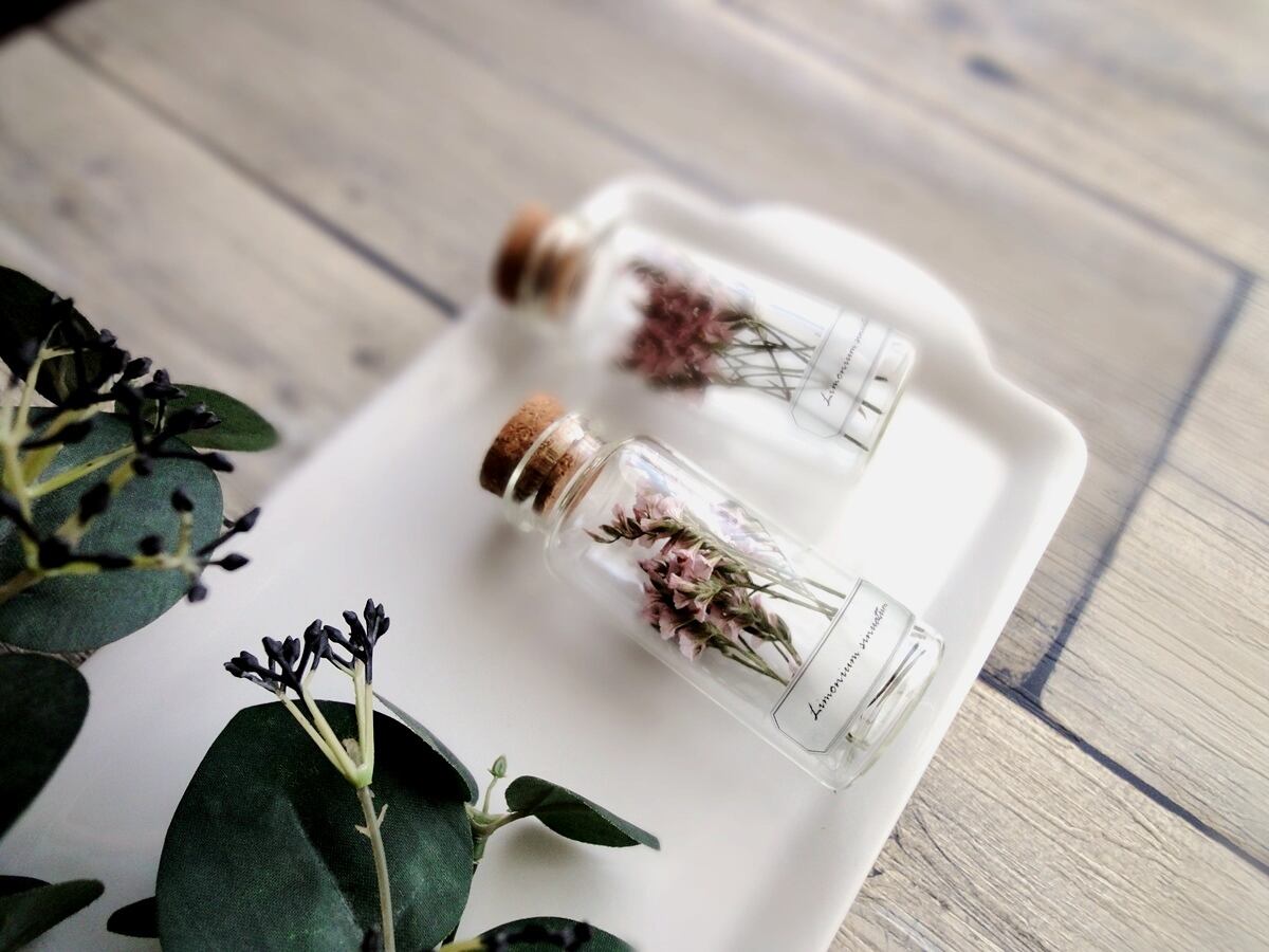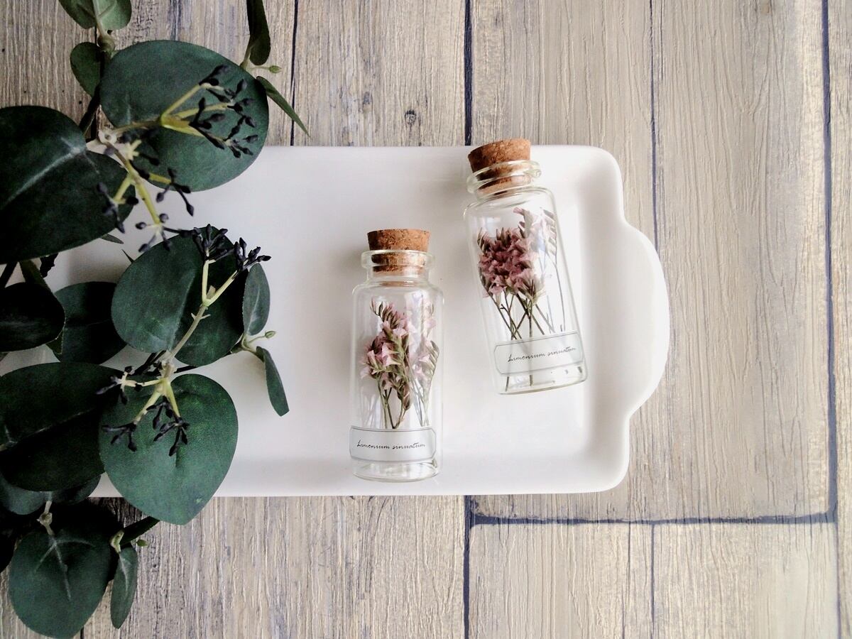手のひらサイズのガラス瓶に、ドライフラワーを丁寧に詰め込みました。