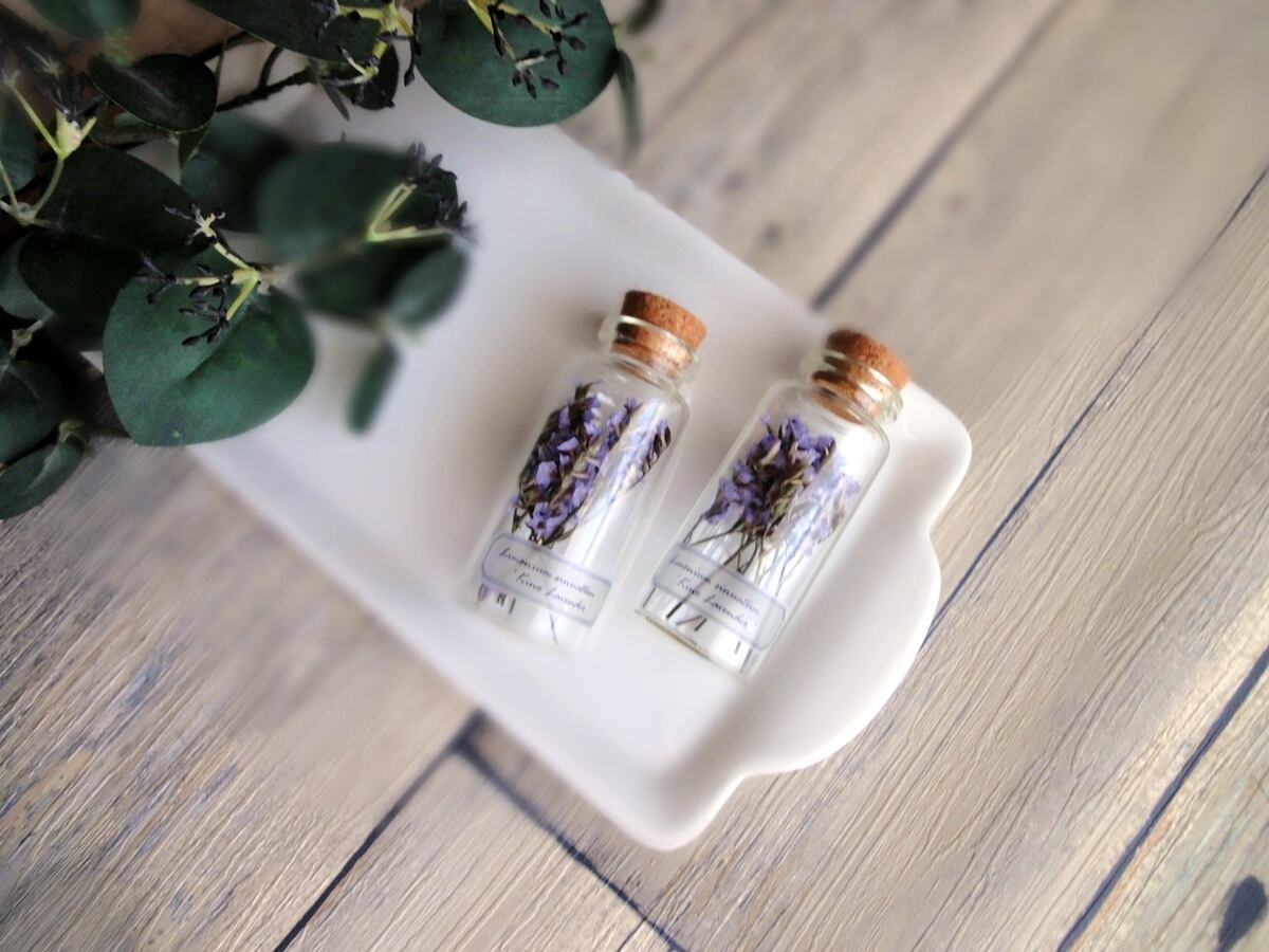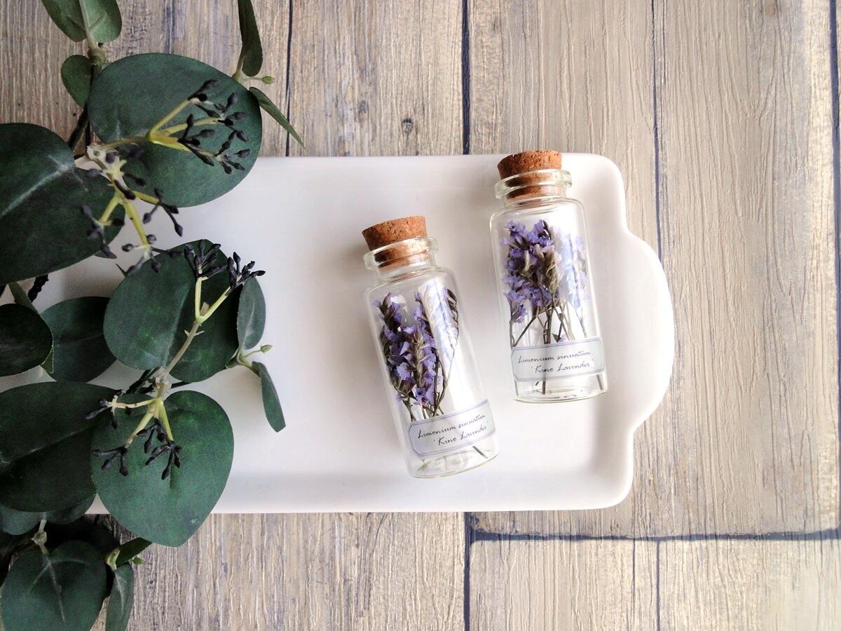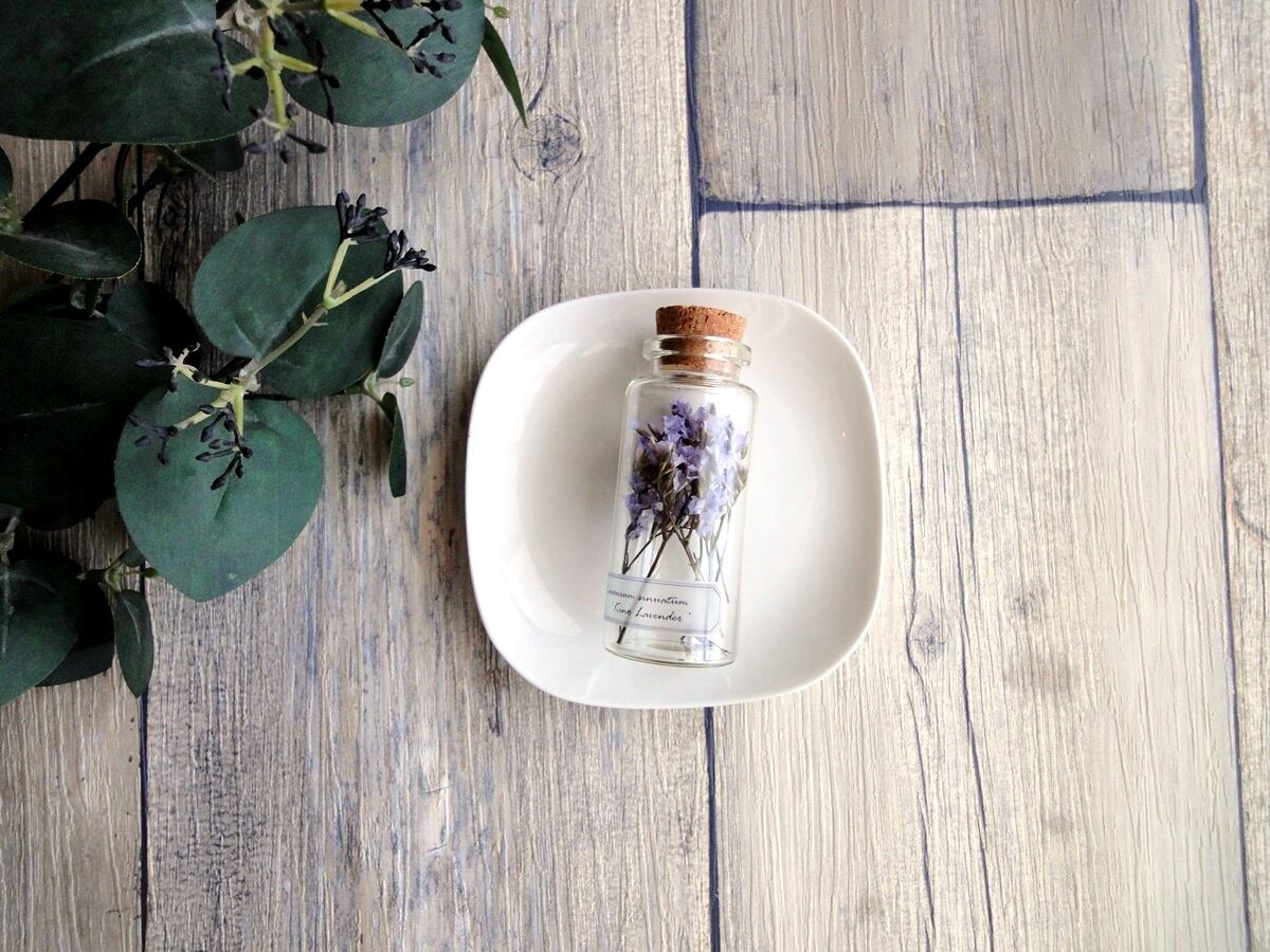 手のひらサイズのガラス瓶に、ドライフラワーを丁寧に詰め込みました。