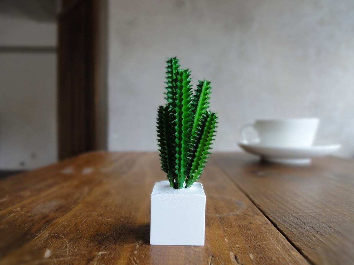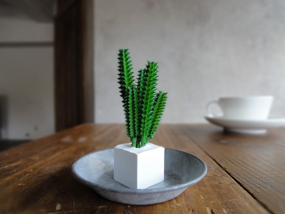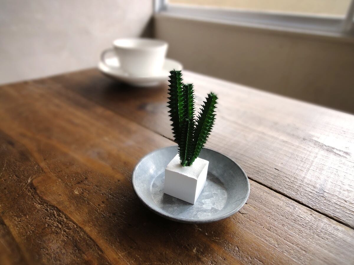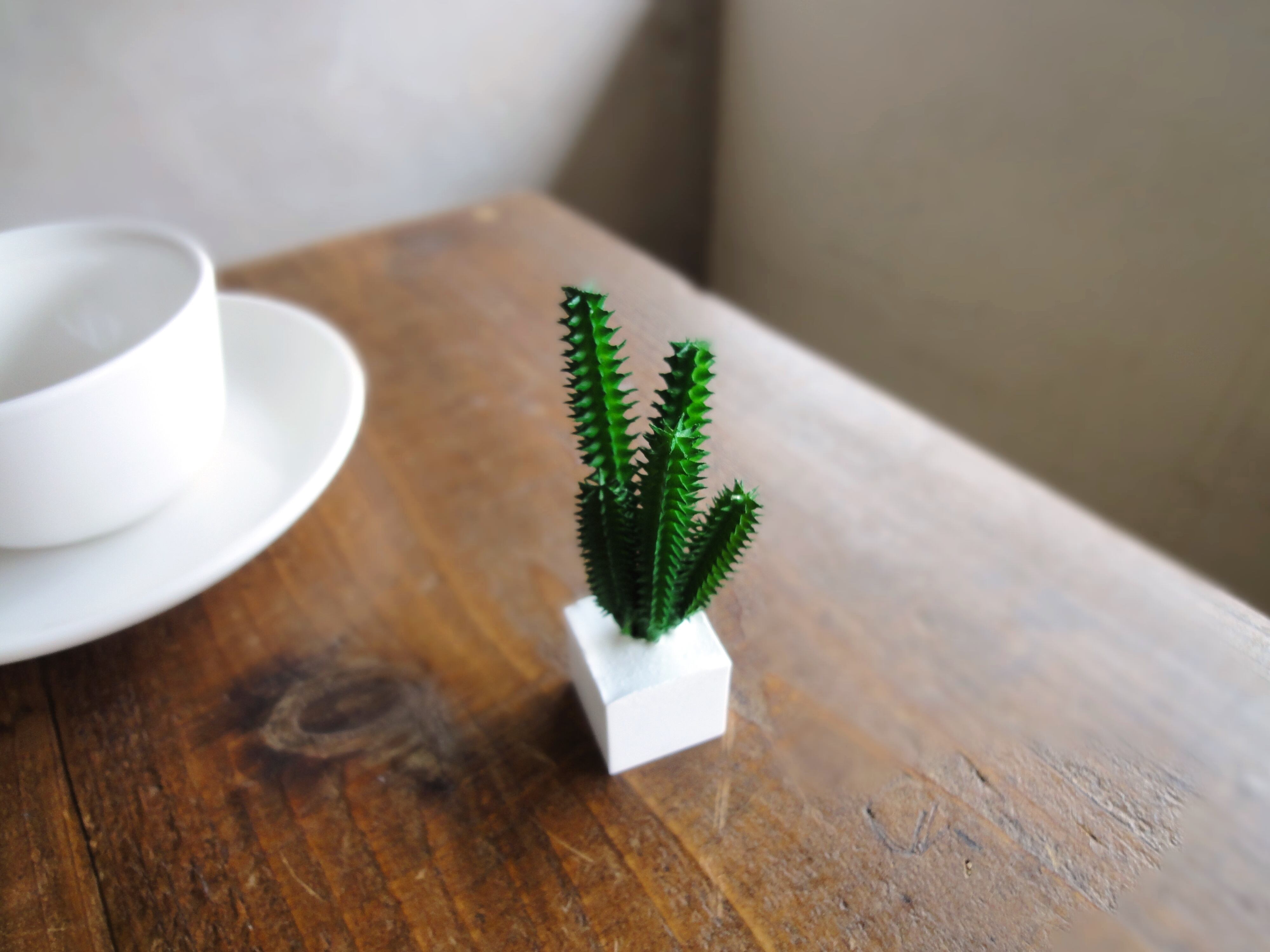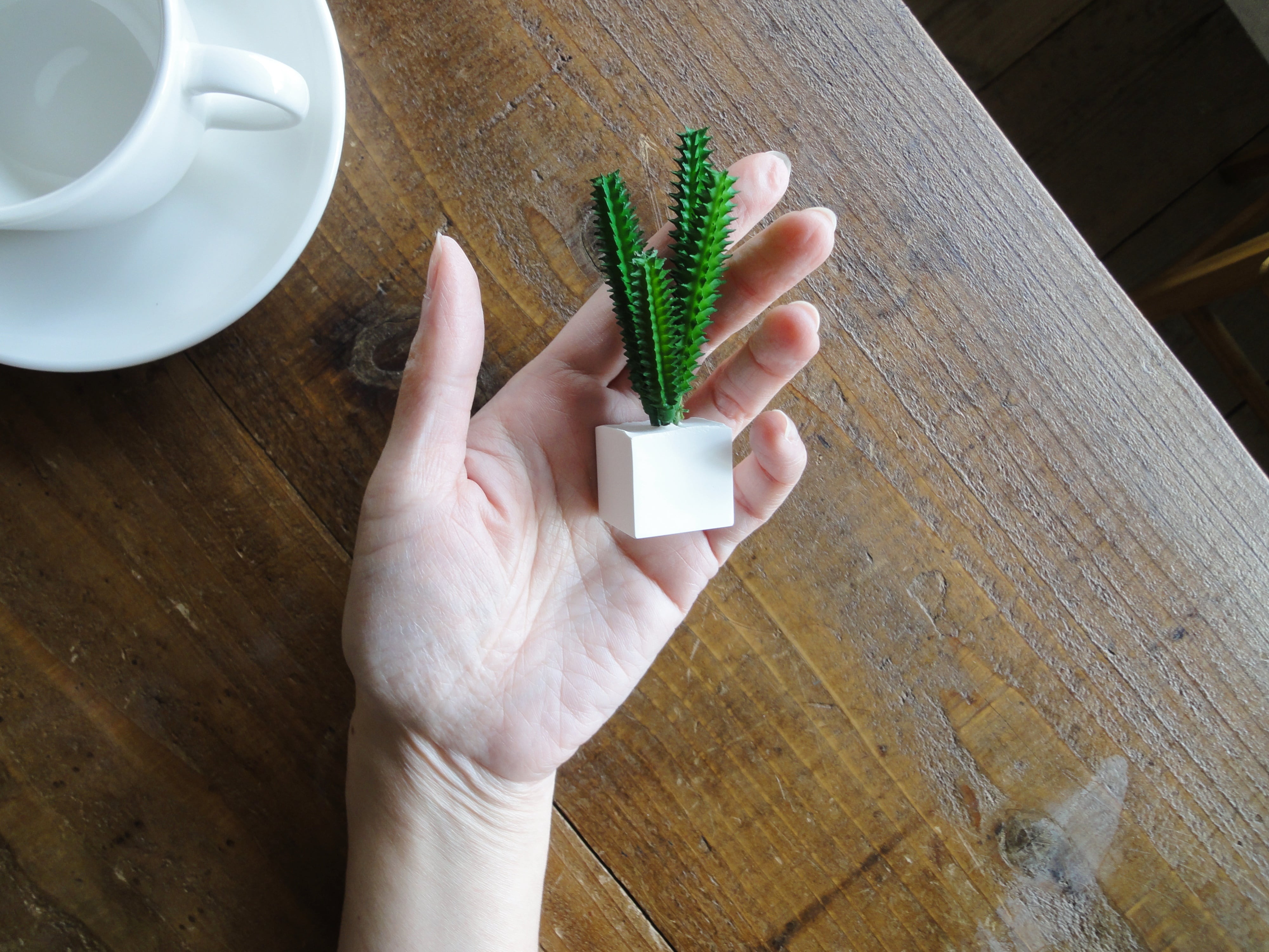そんな多肉植物の面々のフェイクグリーンをひとつずつ、丁寧にアロマストーンの小さなキューブに植え込みました。フェイクグリーンですから、育てるコツもスキルもいりません。日の当たらない場所、お手洗いや洗面所、寝室にも置いて楽しめます。