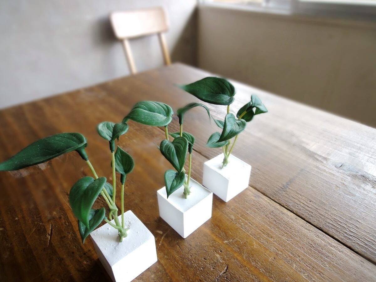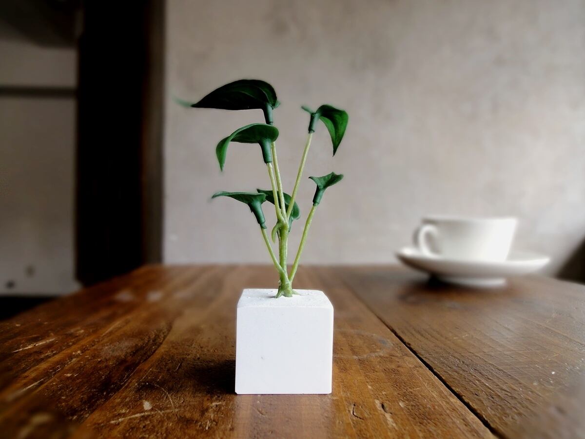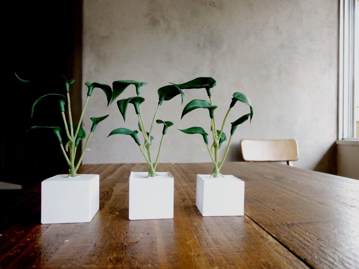 そんな多肉植物の面々のフェイクグリーンをひとつずつ、丁寧にアロマストーンの小さなキューブに植え込みました。フェイクグリーンですから、育てるコツもスキルもいりません。日の当たらない場所、お手洗いや洗面所、寝室にも置いて楽しめます。