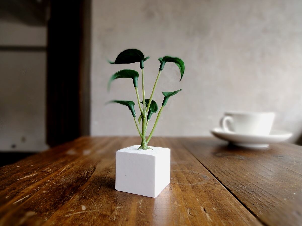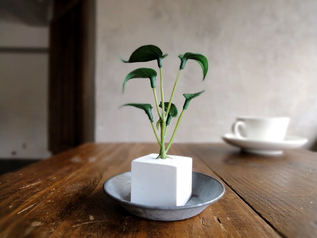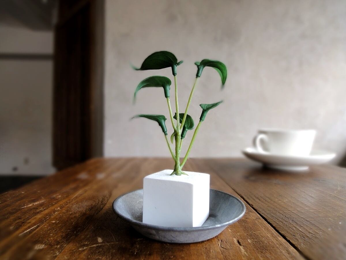 そんな多肉植物の面々のフェイクグリーンをひとつずつ、丁寧にアロマストーンの小さなキューブに植え込みました。フェイクグリーンですから、育てるコツもスキルもいりません。日の当たらない場所、お手洗いや洗面所、寝室にも置いて楽しめます。