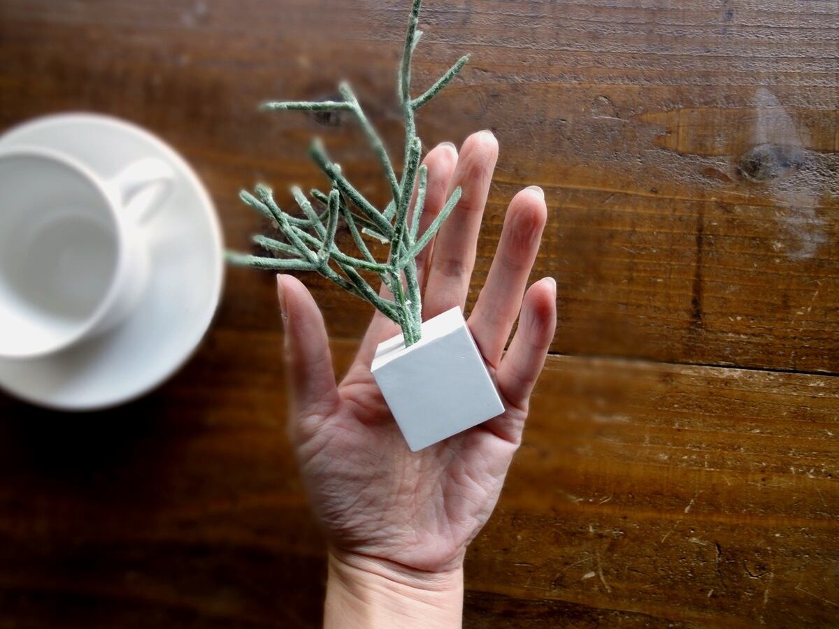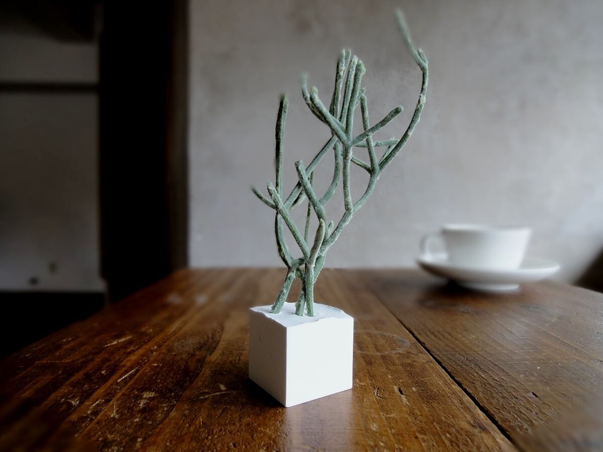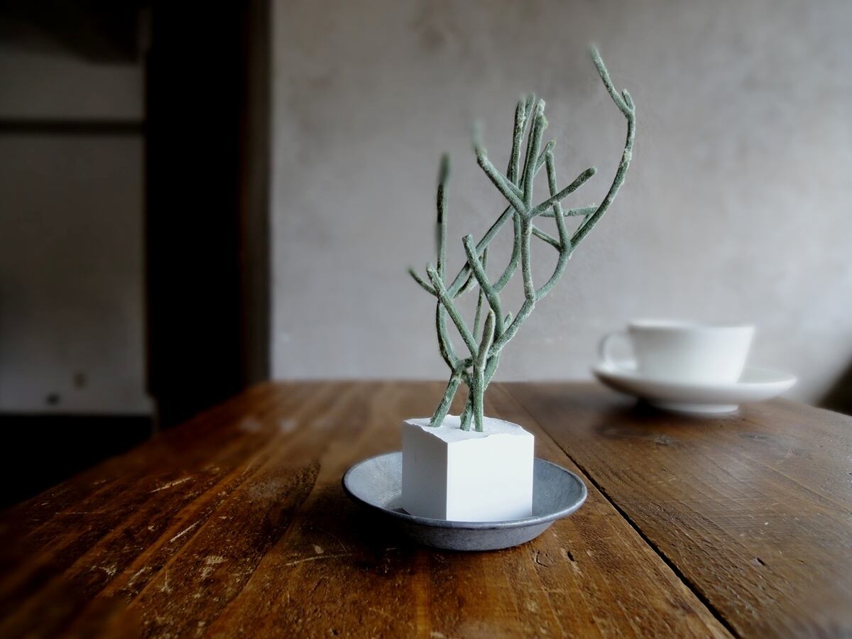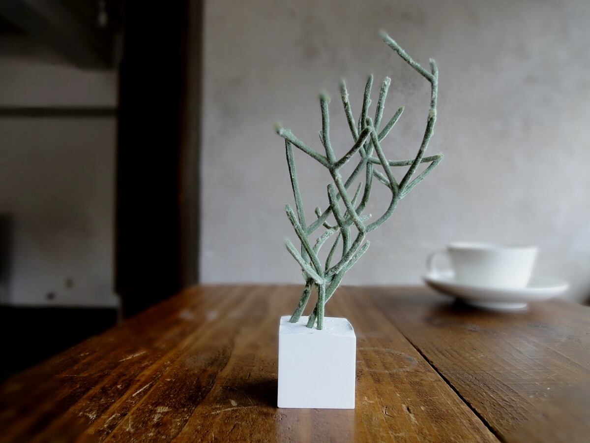 そんな多肉植物の面々のフェイクグリーンをひとつずつ、丁寧にアロマストーンの小さなキューブに植え込みました。フェイクグリーンですから、育てるコツもスキルもいりません。日の当たらない場所、お手洗いや洗面所、寝室にも置いて楽しめます。