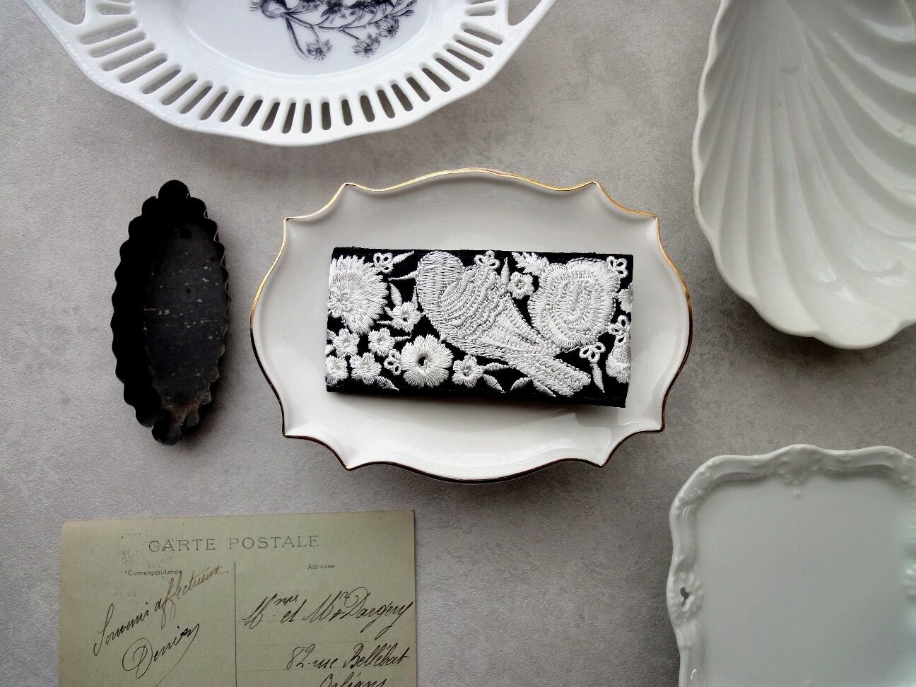 黒地に白銀色の小鳥や花々が生き生きと刺繍で表現された、