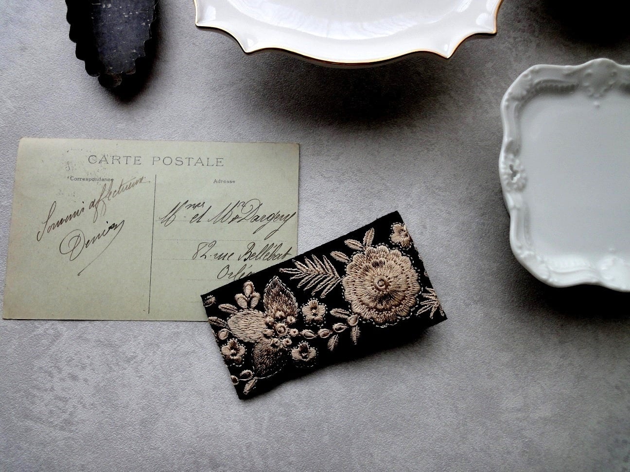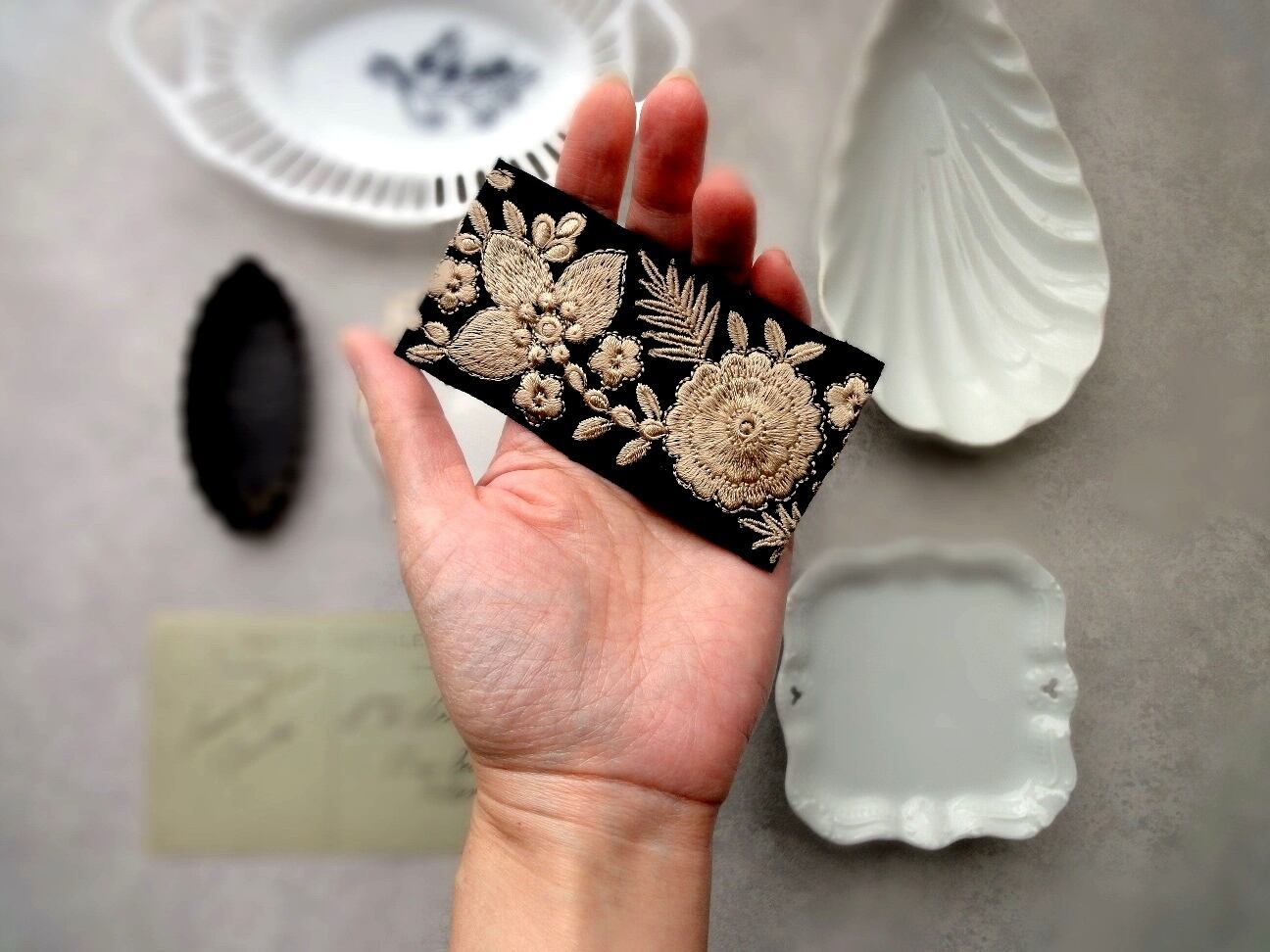 髪の毛をゴムで結んだ上に簡単に止めるだけで楽しめる、リボンの美しさを楽しめるヘアクリップ。黒地に黄金色の糸で花や木の葉、木の実が丁寧に刺繍で表現された、繊細かつ豪華な雰囲気の刺繍リボン。そのリボンの美しさを存分に楽しめるよう、シンプルなデザインでヘアクリップに仕立てました。裏面はフェルトで覆われているので使いやすく、芯が入っているのでしっかりした安定感があります。