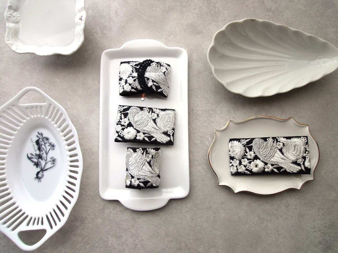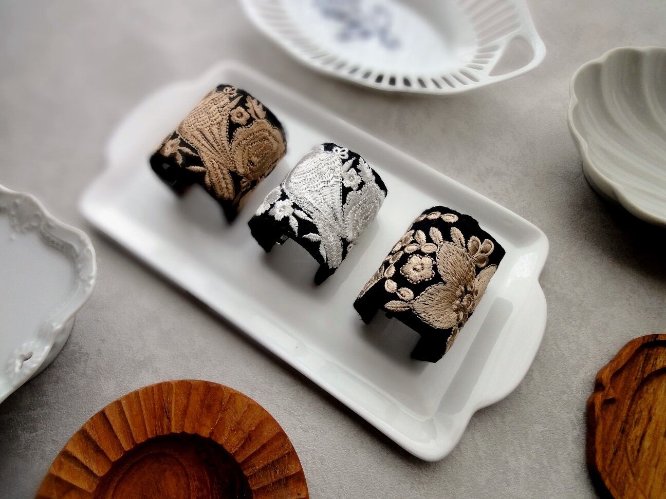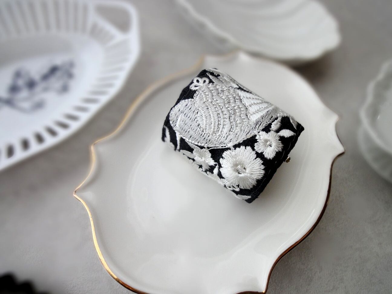 髪の毛をゴムで結んだ上に差し込んで、簡単に楽しめるポニーフック。黒地に白銀色の小鳥や花々が生き生きと刺繍で表現された、繊細かつ豪華な雰囲気の刺繍リボン。そのリボンの美しさを存分に楽しめるシンプルなデザインでありつつ、髪を結ぶヘアゴム部分をしっかり包み隠してくれる、カーブデザインのポニーフックに仕立てました。