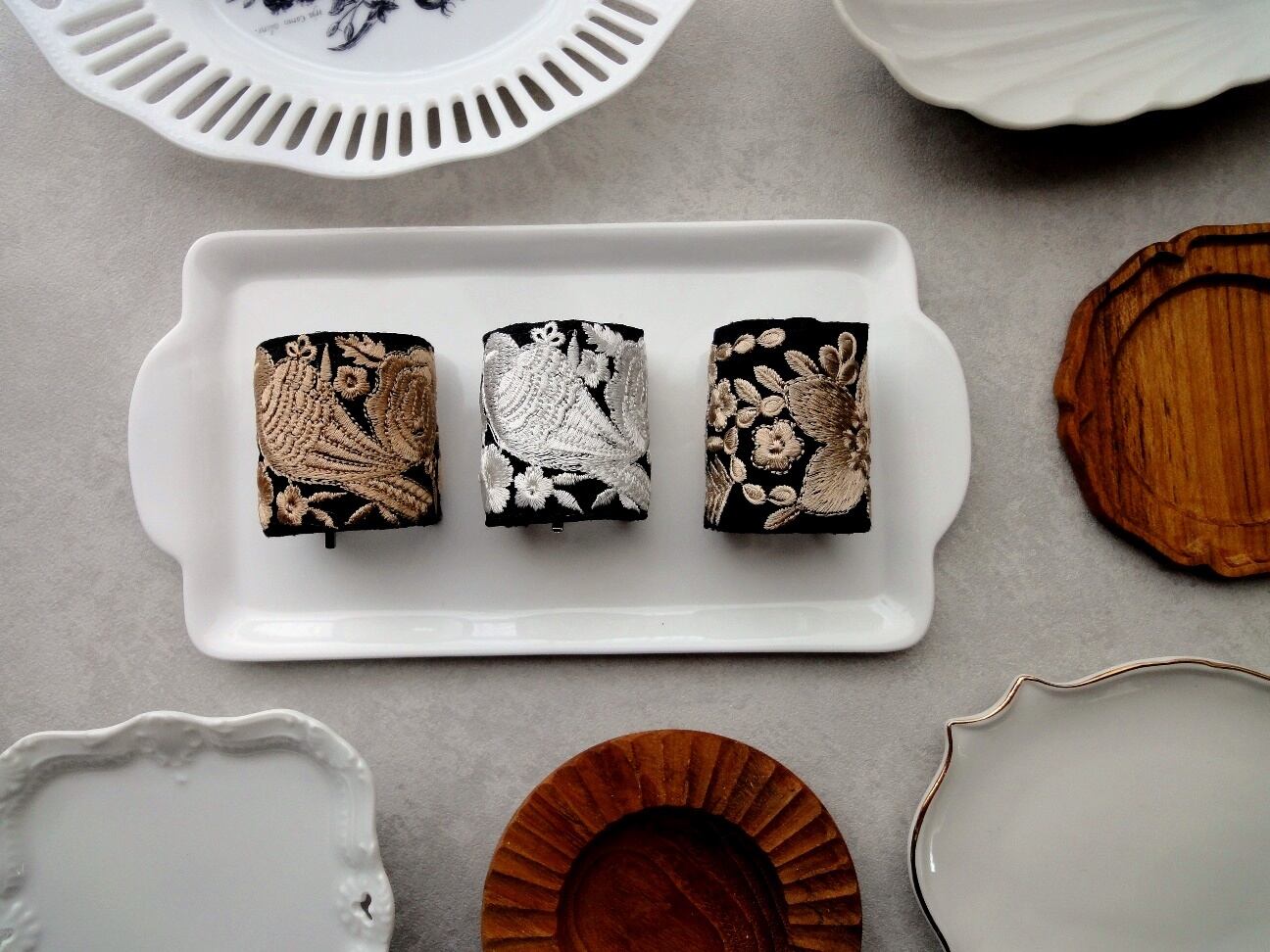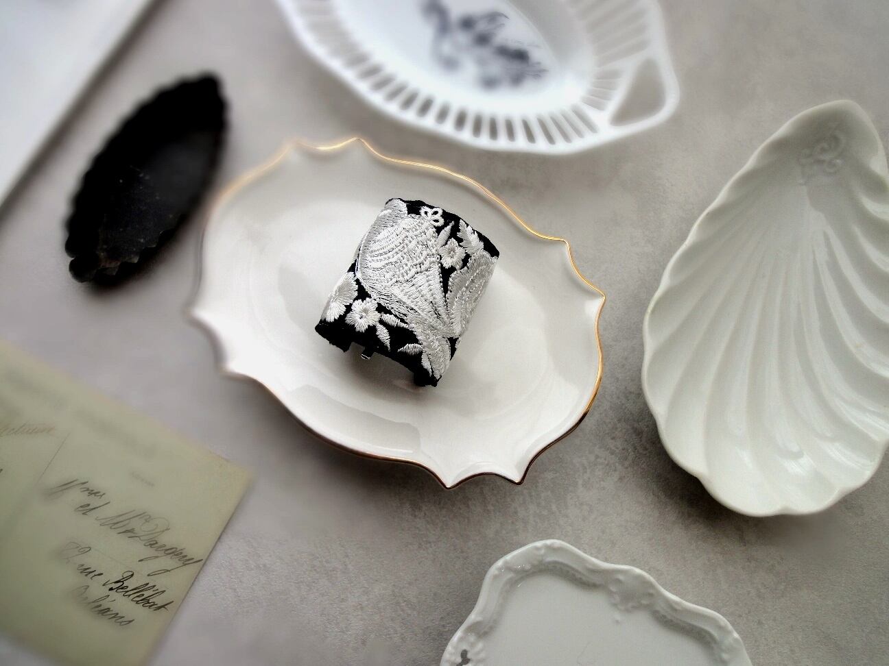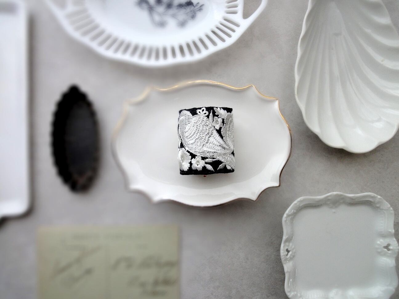 髪の毛をゴムで結んだ上に差し込んで、簡単に楽しめるポニーフック。黒地に白銀色の小鳥や花々が生き生きと刺繍で表現された、繊細かつ豪華な雰囲気の刺繍リボン。そのリボンの美しさを存分に楽しめるシンプルなデザインでありつつ、髪を結ぶヘアゴム部分をしっかり包み隠してくれる、カーブデザインのポニーフックに仕立てました。